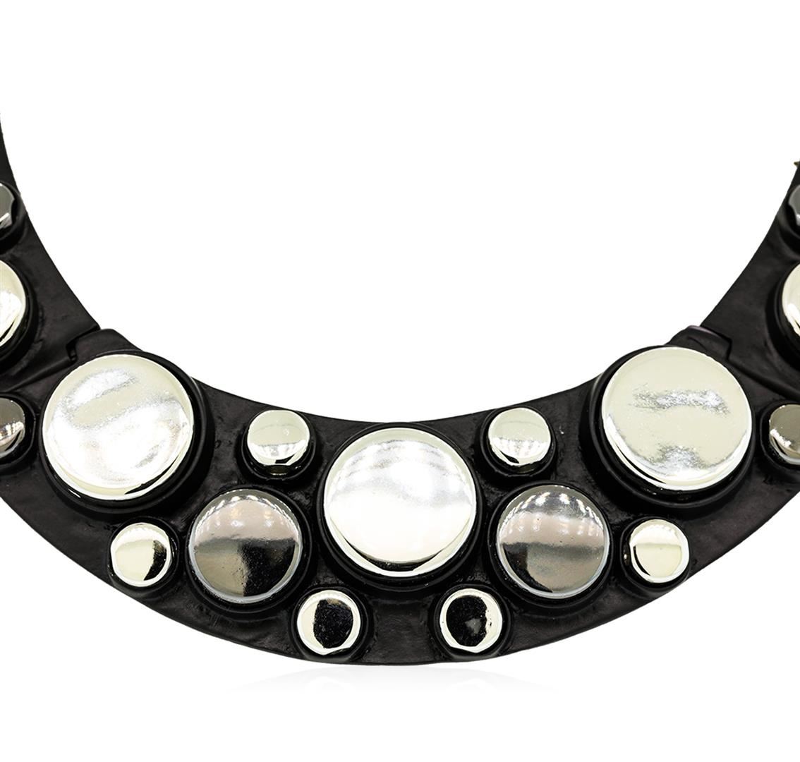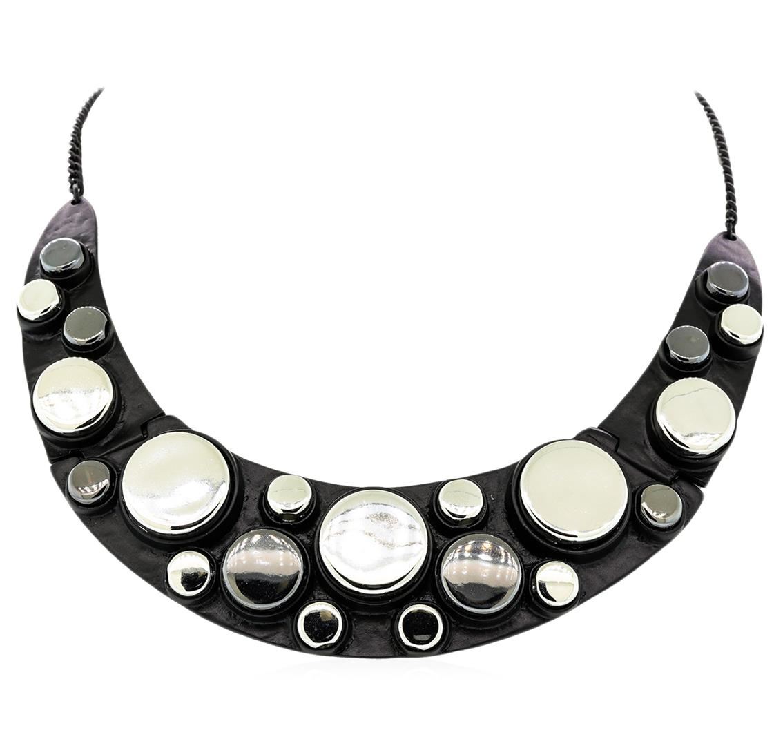 High end designer jewelry. Metallic Button Bib Necklace - Black Plated. Black Tone Basic Metal/2.5" Ext Clasp. Black/ Silver. 16inches.
