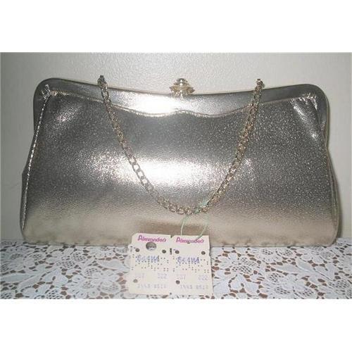 Metallics have made a big fashion comeback on the runways this year and this sweet little retro purse has returned fashion full circle! In Mint condition and never worn, this lovely "gold foil" leatherette handbag or clutch purse - adaptable. The gold tone chain handle is fully retractable and will sit inside if you wish to wear this purse as a clutch. It is made by Admiral and has the name engraved on to the hinge (as in the last photo) but no labels inside. The interior is lined in a peach / gold color satin, flawless and perfect and still with the original paper stuffing inside. The store tag indicates that it originated from Alexander's and the original price would appear to be $3.22 !! Measurements are 10" inches wide by 5" inches in height and 1-3/4" inches in depth. The retractable carry handle has a height of 4" inches from the top of the frame - which has a pretty scalloped design in the front.