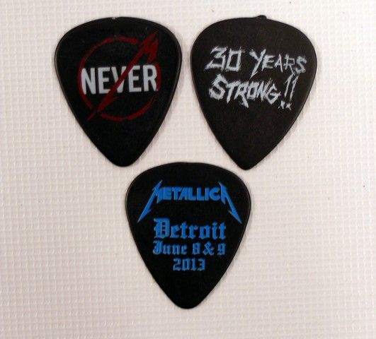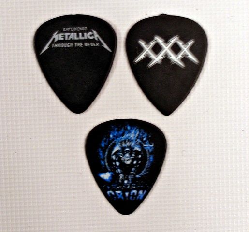 Three guitar picks from Metallica's San Diego Comic-Con "Secret Show" held at Spreckels Theatre on July 19, 2003. The person selling these picks was there and obtained these in person from the stage. Some of them were given / thrown by the band members during the show - and rest were on the stage floor.