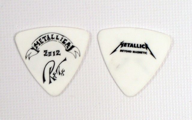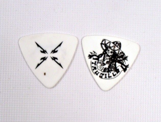 Two guitar picks from Metallica's San Diego Comic-Con "Secret Show" held at Spreckels Theatre on July 19, 2003. The person selling these picks was there and obtained these in person from the stage. Some of them were given / thrown by the band members during the show - and rest were on the stage floor.