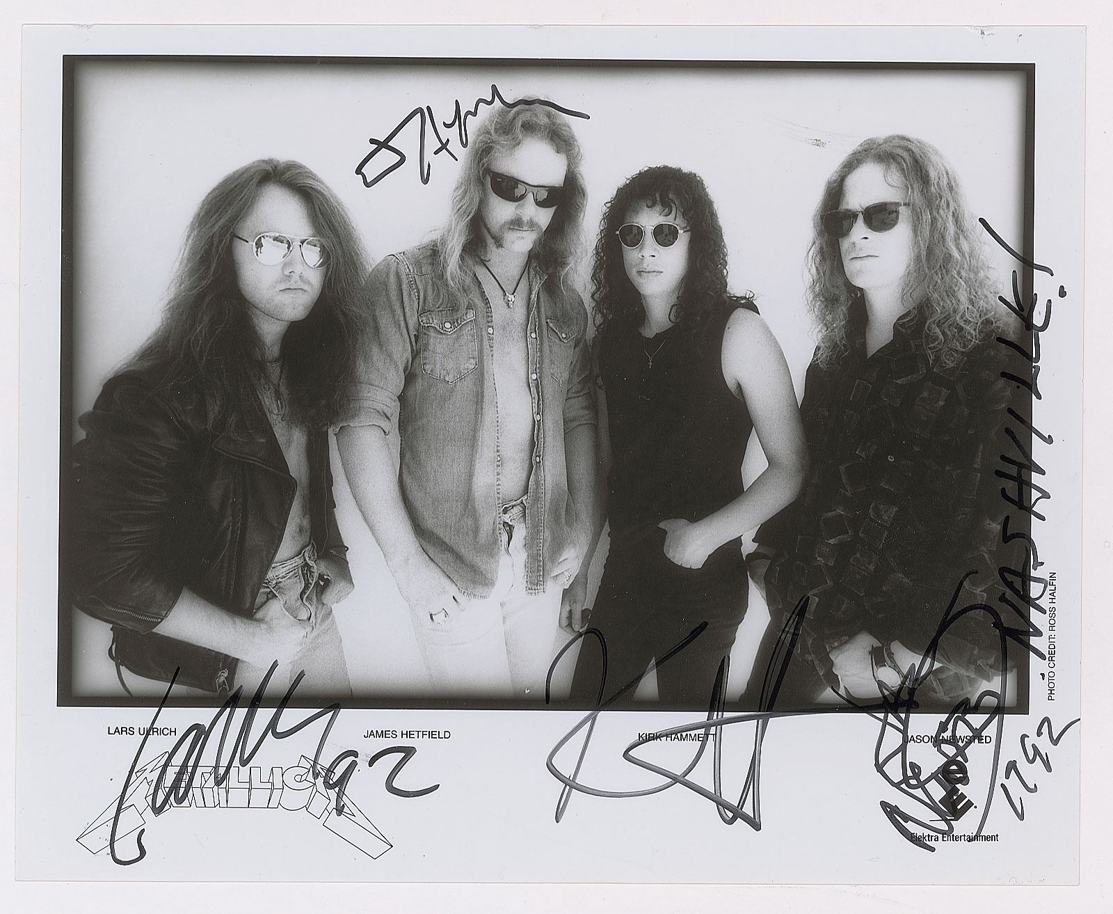 Satin-finish 10 x 8 Elektra publicity photo of Metallica, signed in black felt tip by James Hetfield, Lars Ulrich, who adds "92," Kirk Hammett, and Jason Newsted, who adds "1992, Nashville!" In fine condition. On March 9, 1992, Metallica played the Nashville Municipal Auditorium during the Wherever We May Roam Tour.