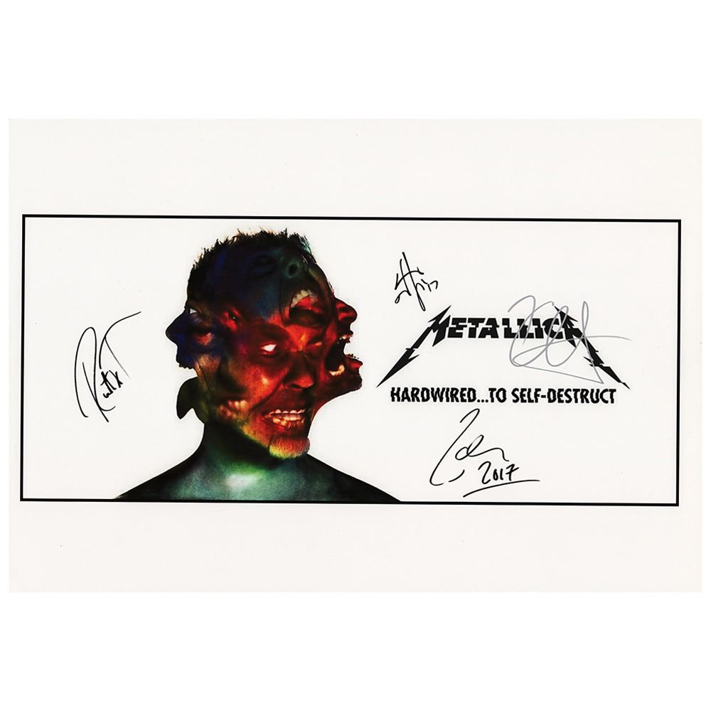 Color 19 x 13 print of the album artwork for Metallica's 2016 album Hardwired…To Self-Destruct, signed in black felt tip by James Hetfield, Robert Trujillo, and Lars Ulrich, and in silver ink by Kirk Hammett. In very fine condition.