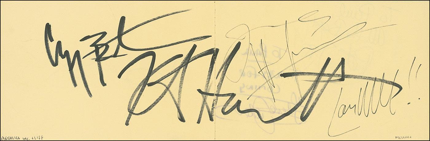 Autograph album, 6.25 x 4.25, signed inside in ink by the four founding members of Metallica: Cliff Burton, James Hetfield, Lars Ulrich, and Kirk Hammett. Hammett’s signature spreads across two pages of the autograph book, with a Brian May signature on the back of one of the Metallica pages and several other heavy Metal autographs included in the book. In fine condition. The consignor notes that the autographs were signed in Newcastle England September 19, 1986, 8 days before Cliff’s death.