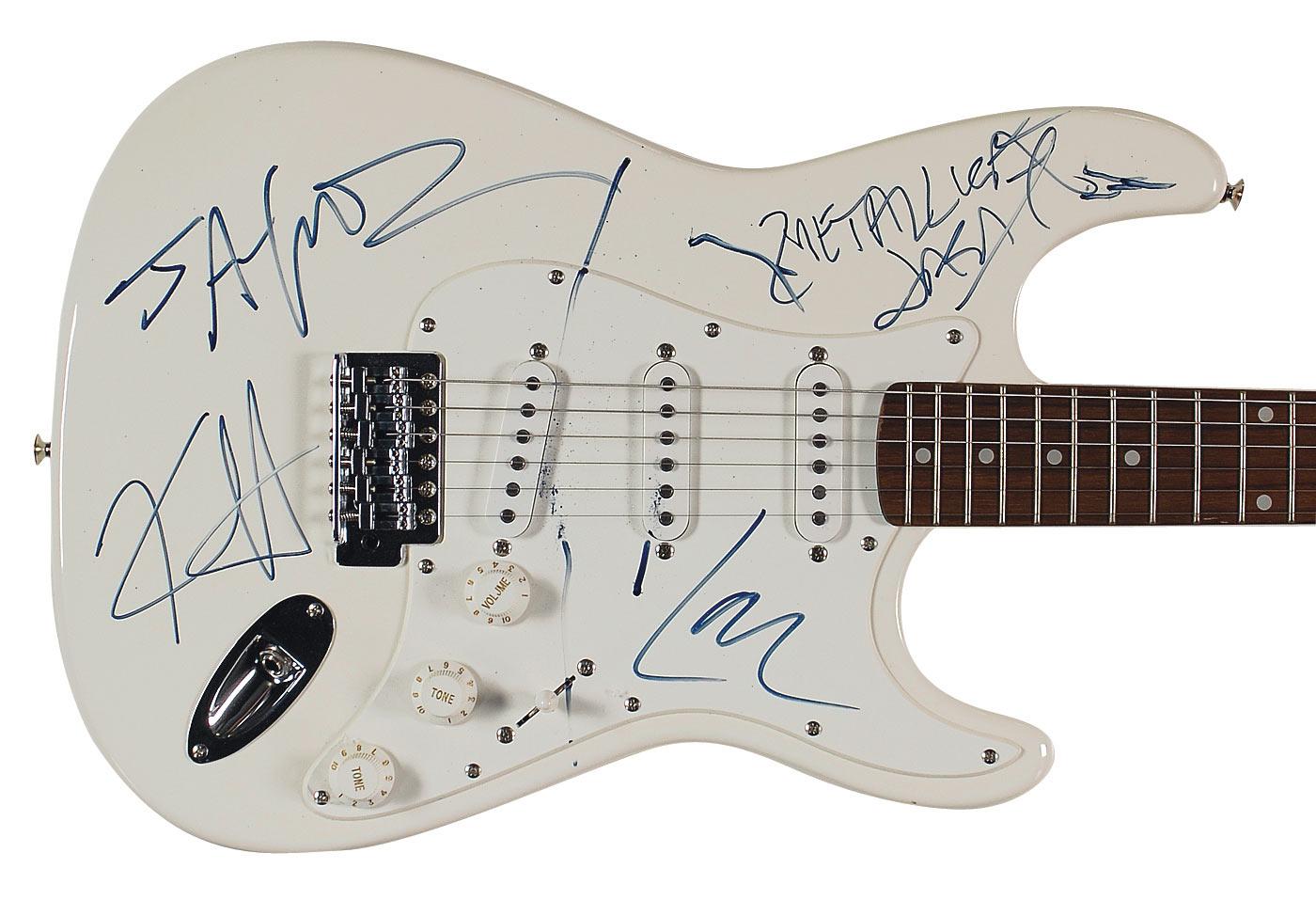 Cream-colored Synconics Pro Series ‘stratocaster-style’ electric guitar, signed on the body in black felt tip by James [Hetfield] adding the band’s name, Kirk [Hammett], and Jason Newsted, and signed in black felt tip on the off-white pickguard by Lars [Ulrick]. In fine condition, with a stray vertical felt tip mark across the body, and over the strings, resulting in some residue to the pickguard. Oversized.