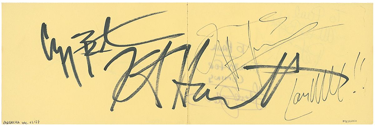 Ink and felt tip signatures of the four founding members of Metallica: Cliff Burton, James Hetfield, Lars Ulrich, and Kirk Hammett, on two adjoined 6 x 4 light yellow album pages. Pages are still contained in their original autograph album, with a Brian May signature on the back of one of the Metallica pages and several other heavy Metal autographs included in the book. In fine condition. Consignor notes that the autographs were signed in Newcastle, England, on September 19, 1986, just eight days before Cliff’s death.