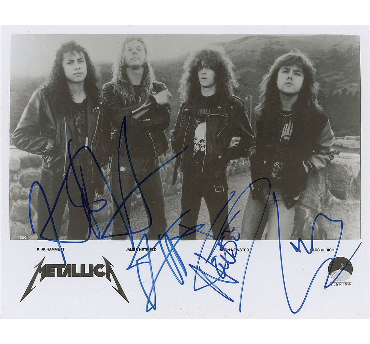 Glossy 10 x 8 Elektra Records publicity photo, signed in-person in blue felt tip by Kirk Hammett, James Hetfield, Jason Newsted, and Lars Ulrich. In very fine condition. Originally obtained by in-person specialist Mike Wehrmann.