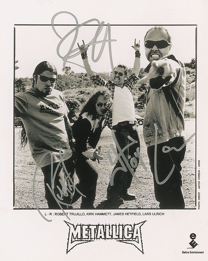Satin-finish 8 x 10 Elektra publicity photo, signed in silver ink by James Hetfield, Kirk Hammett, Lars Ulrich, and Robert Trujillo, all signing first names only. In very fine condition.
