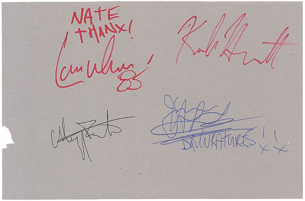 Vintage ink signatures and inscription, “Nate Thanx! Lars Ulrich ’85,” “Kirk Hammett,” “Cliff Burton,” and “James Hetfield, DRUNKATURES!!,” on an off-white 9 x 5.75 sheet. In fine condition, with trivial paper loss to left edge. Accompanied by a certificate of authenticity from Roger Epperson/REAL. An uncommon example of the four founding members.