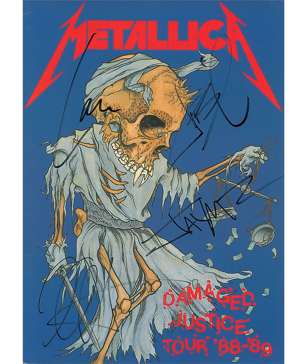 Program for Metallica’s 1988–89 Damaged Justice Tour, 9.75 x 13.5, signed on the front cover in black felt tip by Lars Ulrich, James Hetfield, Kirk Hammett, and Jason Newsted. In fine condition. Accompanied by a full letter of authenticity from Roger Epperson/REAL.