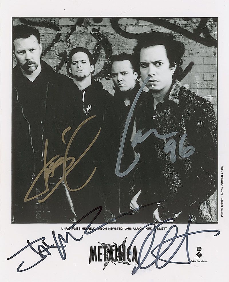 Satin-finish 8 x 10 Elektra Entertainment publicity photo of the group, signed in various inks by Lars Ulrich, James Hetfield, Kirk Hammett, and Jason Newsted. In fine condition, with a noticeable but unobtrusive crease to the upper border. Accompanied by a full letter of authenticity from Roger Epperson/REAL.