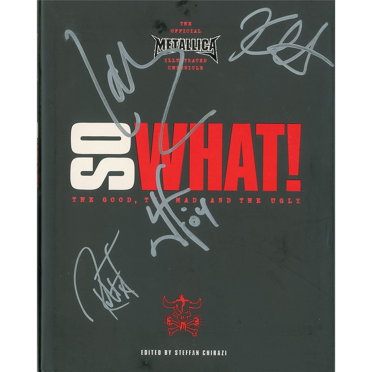 Signed book: So What!. First edition, first printing. NY: Broadway Books, 2004. Hardcover with dust jacket, 8.75 x 11, 273 pages. Signed on the front of the dust jacket in silver ink by Lars Ulrich, James Hetfield, Kirk Hammett, and Robert Trujillo, all signing first names only. Also signed on the inside of the dust jacket by editor Steffan Chirazi. In very fine condition.