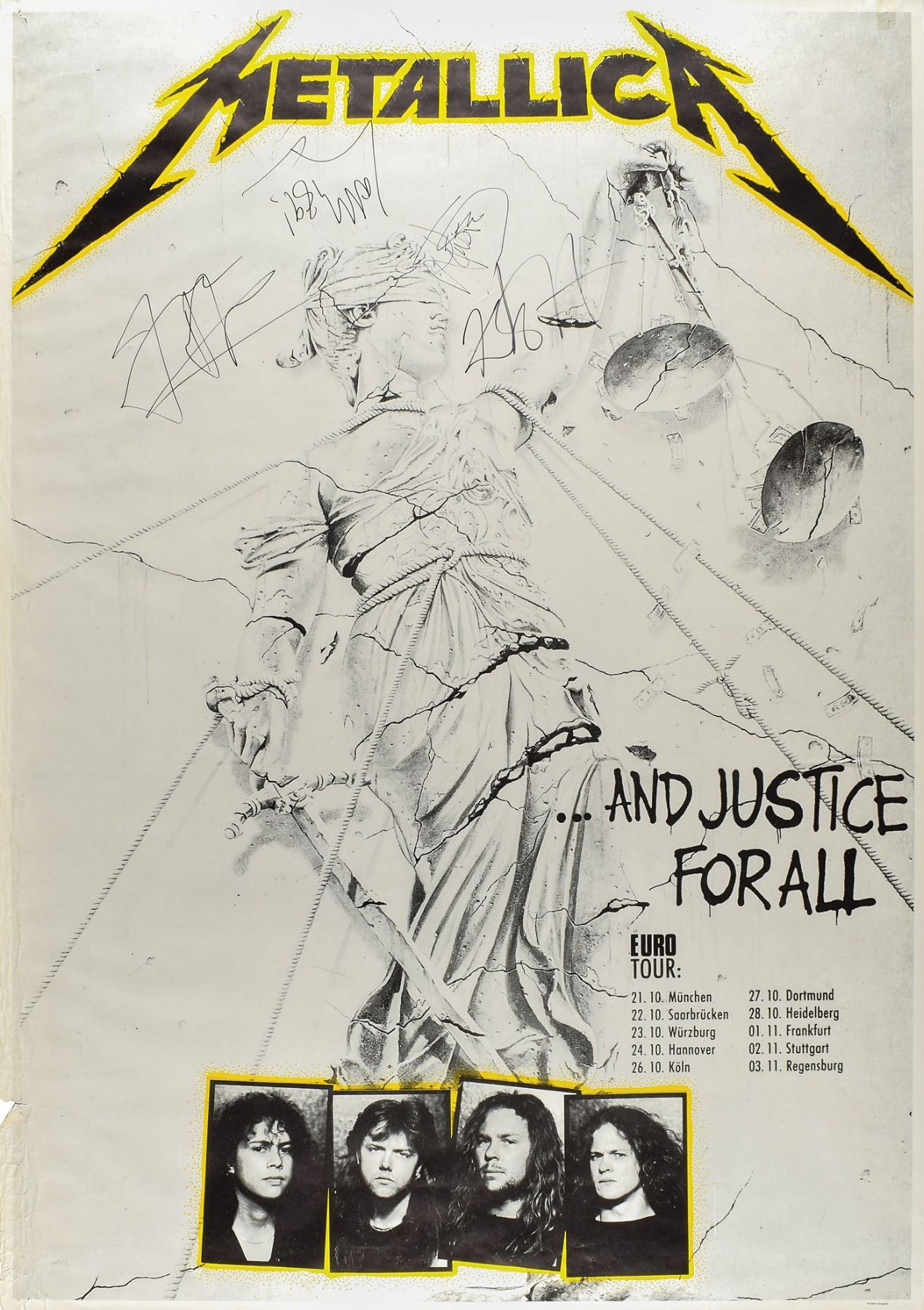 Awesome color 38 x 54 poster showing the cover art for Metallica's 1998 album …And Justice for All and promoting the band's 10 shows in West Germany as part of their massive Damaged Justice Tour, signed in the upper portion in black felt tip by James Hetfield, Kirk Hammett, Jason Newsted, and Lars Ulrich, who signs upside down and adds "89!" Rolled and in very good to fine condition, with creasing, small tears, and tack holes, virtually all constrained to the perimeter and easily matted out if so desired.