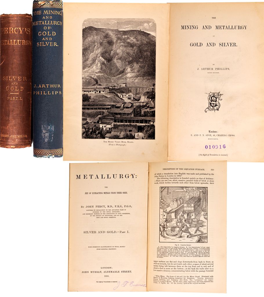 Two very nice metallurgy books: 1) METALLURGY: THE ART OF EXTRACTING METALS FROM THEIR ORES by John Percy, 1880. Stamped throughout with “J. F. Evans” in purple ink. The front cover board also bears three “Hy. Woodcroft-Hammond/ Room 18/ Nevada Block/ San Francisco, Cal.” Stamps. The title page is also signed “Geo. W. Riter/ June 1900”. Woodcut illustrations and thorough explanations of gold and silver metallurgy. Brown, hard bound with gold embossing on spine. 2) THE MINING AND METALLURGY OF GOLD AND SILVER by J. Arthur Phillips, 1867. Blue hard bound with gold embossing on spine and cover. Celtic knot border pressed into the cover bindings. Illustrated treatise on the mining and metallurgy of gold and silver. -59909