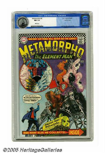 <B>Metamorpho #6 Pacific Coast pedigree (DC, 1966) CGC NM 9.4 White pages.</B></I> Joe Orlando cover and art. Overstreet 2005 NM- 9.2 value = $65. CGC census 6/05: 2 in 9.4, none higher.