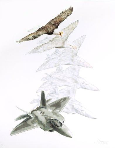 Inspired by the majestic power of the Bald Eagle and the technological wonders of the F-22 Raptor, artist Jody F. Sjogren captures the association between these two "dominant raptors" of the skies. Who has not marveled at this great American bird of prey on the wing, or pondered the fierce force of its curved talons and hooked beak? Wherever it flies, Haliaeetus leucocephalus dominates its territory. Above all other raptors (eagles, hawks, falcons, and owls), it reigns as America's symbol of national pride and strength. In military parallel, Lockheed Martin's F-22 Raptor guarantees "air dominance" in aerial warfare.As the first of the United States Air Force's fifth-generation fighter aircraft, the F-22 prevents hostile aircraft and missiles from denying U.S. operations worldwide, day or night. The Raptor's combination of maneuverability, speed, stealth, integrated avionics, and supportability multiplies its advantages in both air-to-air and air-to-ground environments. In any airspace and any situation, the F-22 gives its pilot unsurpassed control of the engagement. By the genius of its designers, it has become like its living counterpart put here by our Creator the dominant raptor of the skies.This a limited edition of 950, signed and numbered by Jody Sjogren. It's images overall size is 23" x 19 1/2". This print has never been mounted or framed and is in excellent condition.