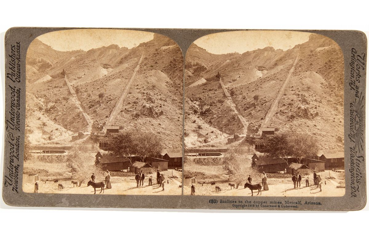 c1900 This is a stereo view copyright 1903, of the incline leading to the copper mines near Metcalf, Arizona. It is from Works & studios of Arlington, New Jersey. Metcalf stopped being an active town in 1936, when the post office pulled up stakes and left for greener pastures. There seems to be a slight bleaching on the left panel. Bud Bassett Collection - HKA#65454