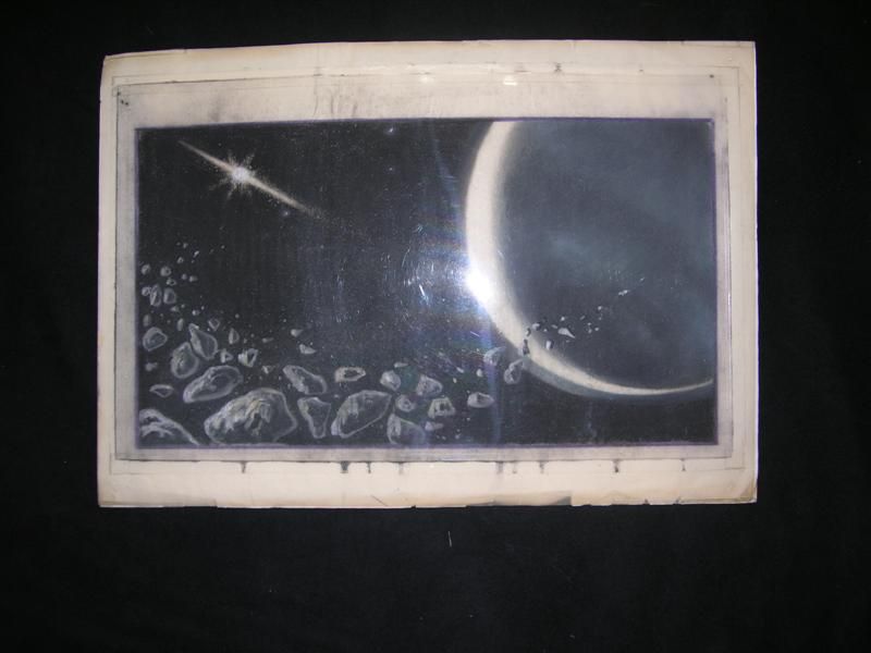 Meteor - Original background drawing – moon and asteroids- heavily creased around the edges