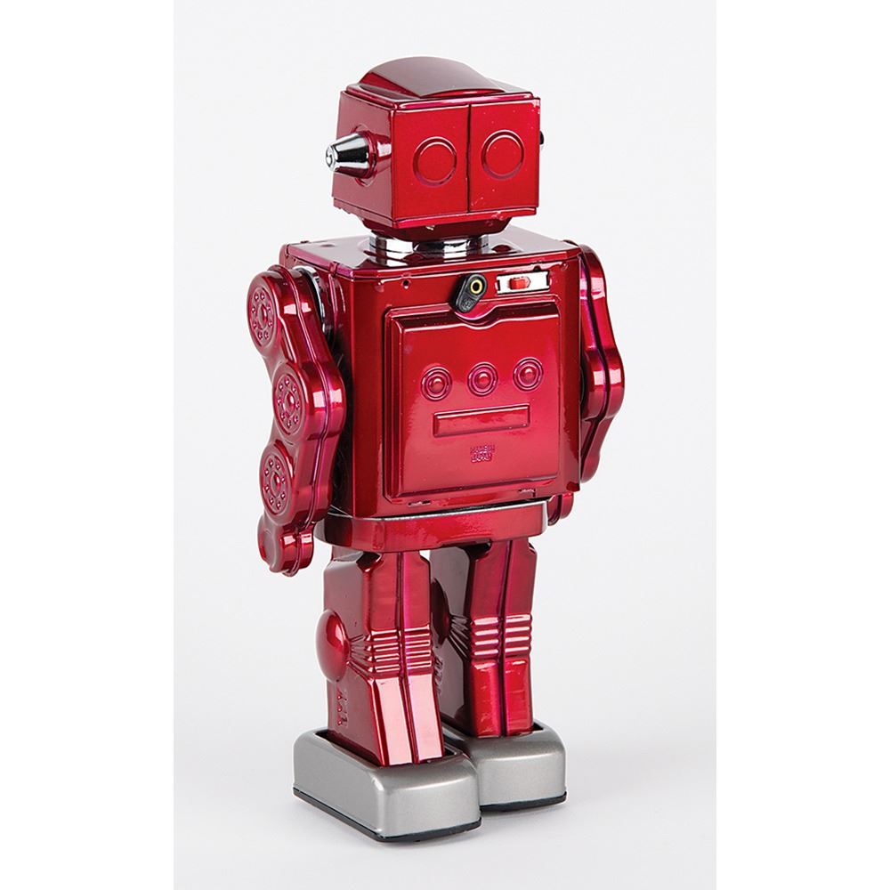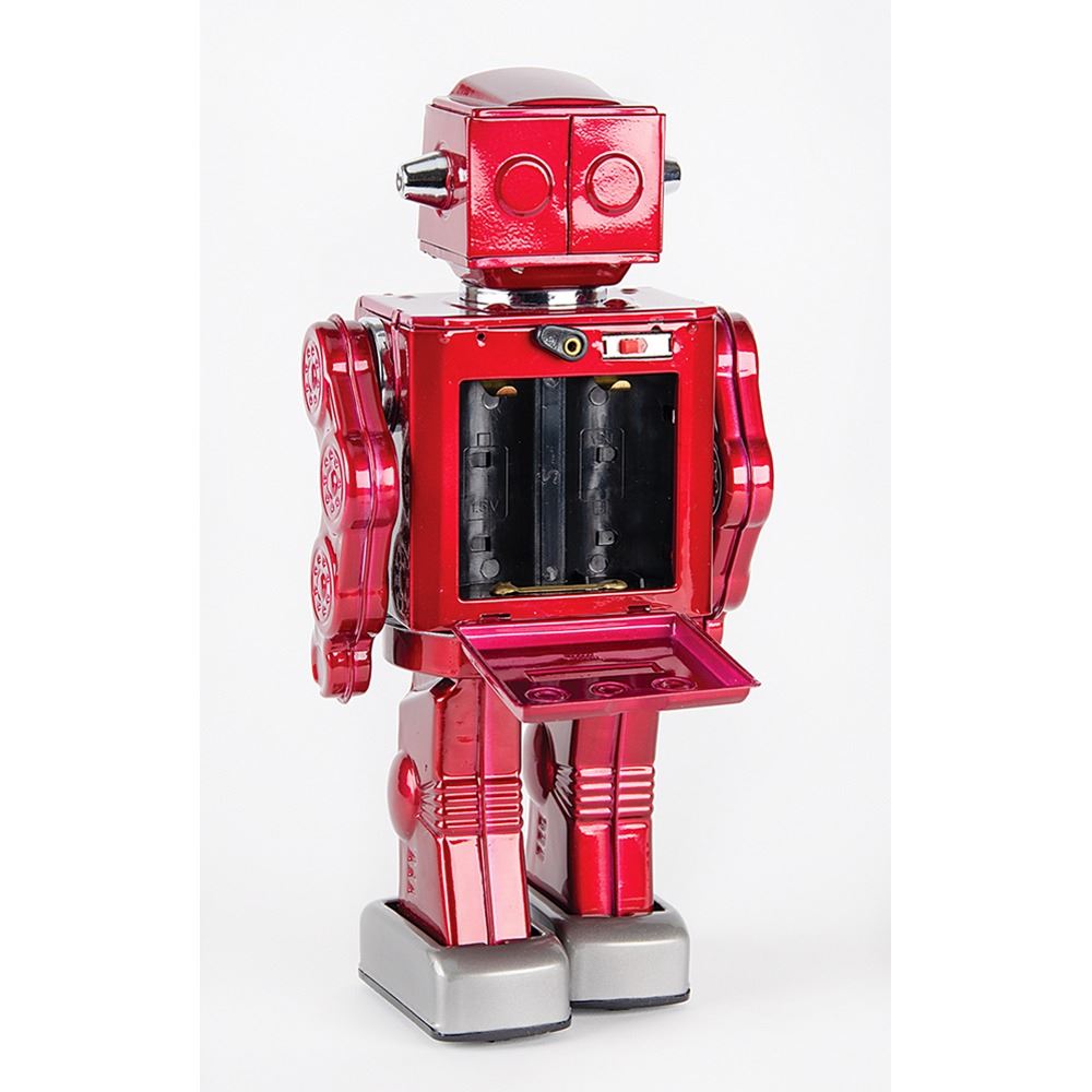 Sought-after circa 2000s battery-operated "Meteor Genie" or "Space Evil Robot" walking tin toy robot, made in Japan by Metal House, standing at 12˝ tall. The appealing retro robot has a burgundy body with classic lithographed designs, silver shoes, and chrome collars—a rare color combination. After its "stop'n go" walking action, the chest doors open, and guns pop out and flash while the torso spins. Includes its original box.