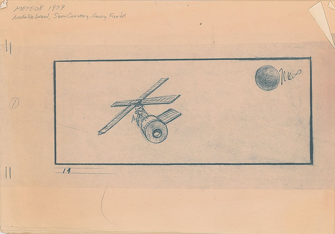 Storyboard reference pages for the 1979 science fiction disaster film Meteor. The storyboard is stapled along left edge and contains 27 total pages, each 15 x 9.75, with detailed artistic images related to scenes 14 through 48. The opening page is annotated in pencil, "Meteor 1979, Natalie Wood, Sean Connery, Henry Fonda," and is marked on the right side in black ballpoint. Pages containing scenes 31 and 47/48 are detached but present, with the reverse of former page bearing various felt tip notations and doodles. Tightly rolled and in very good to fine condition, with expected signs of use.