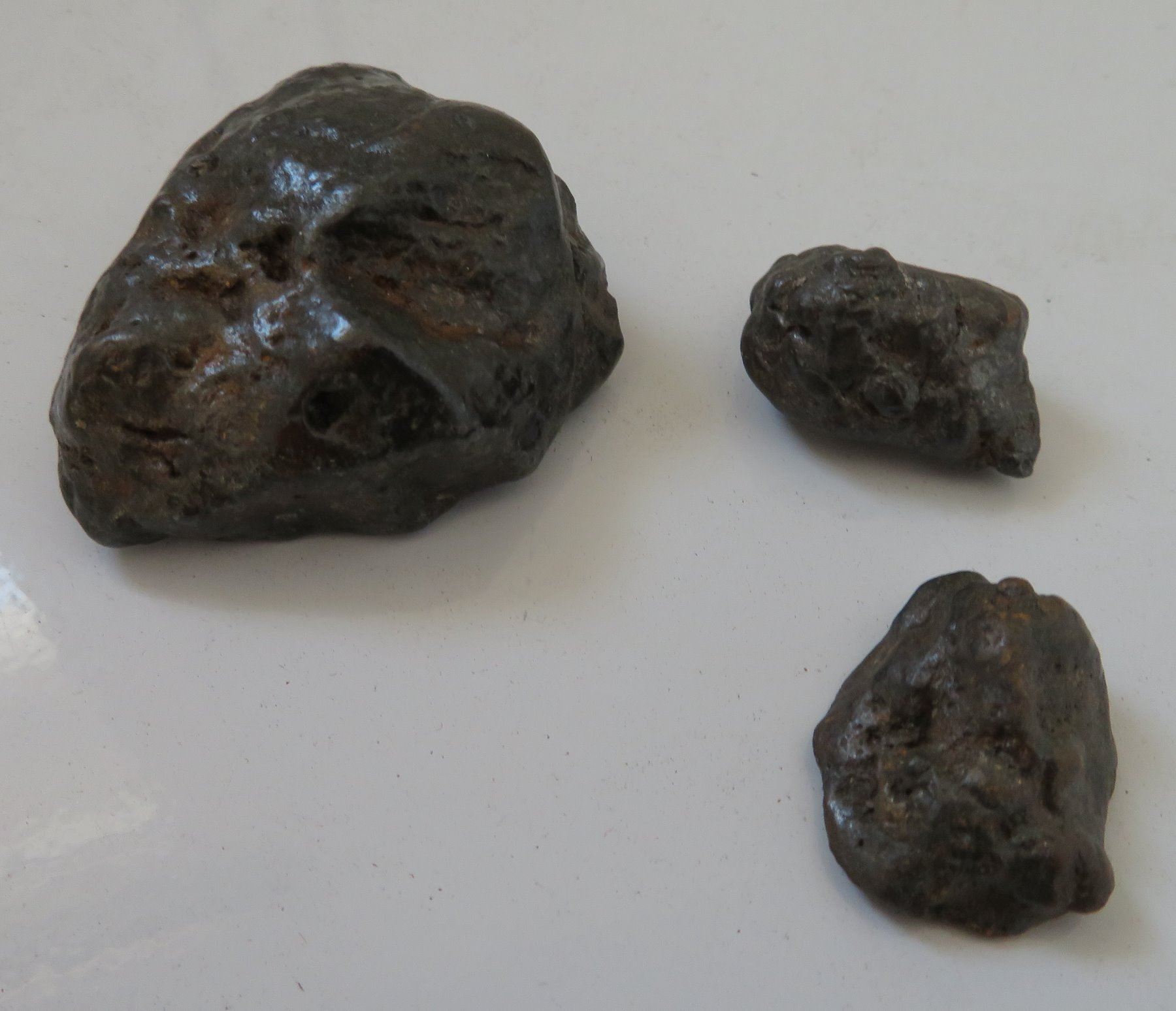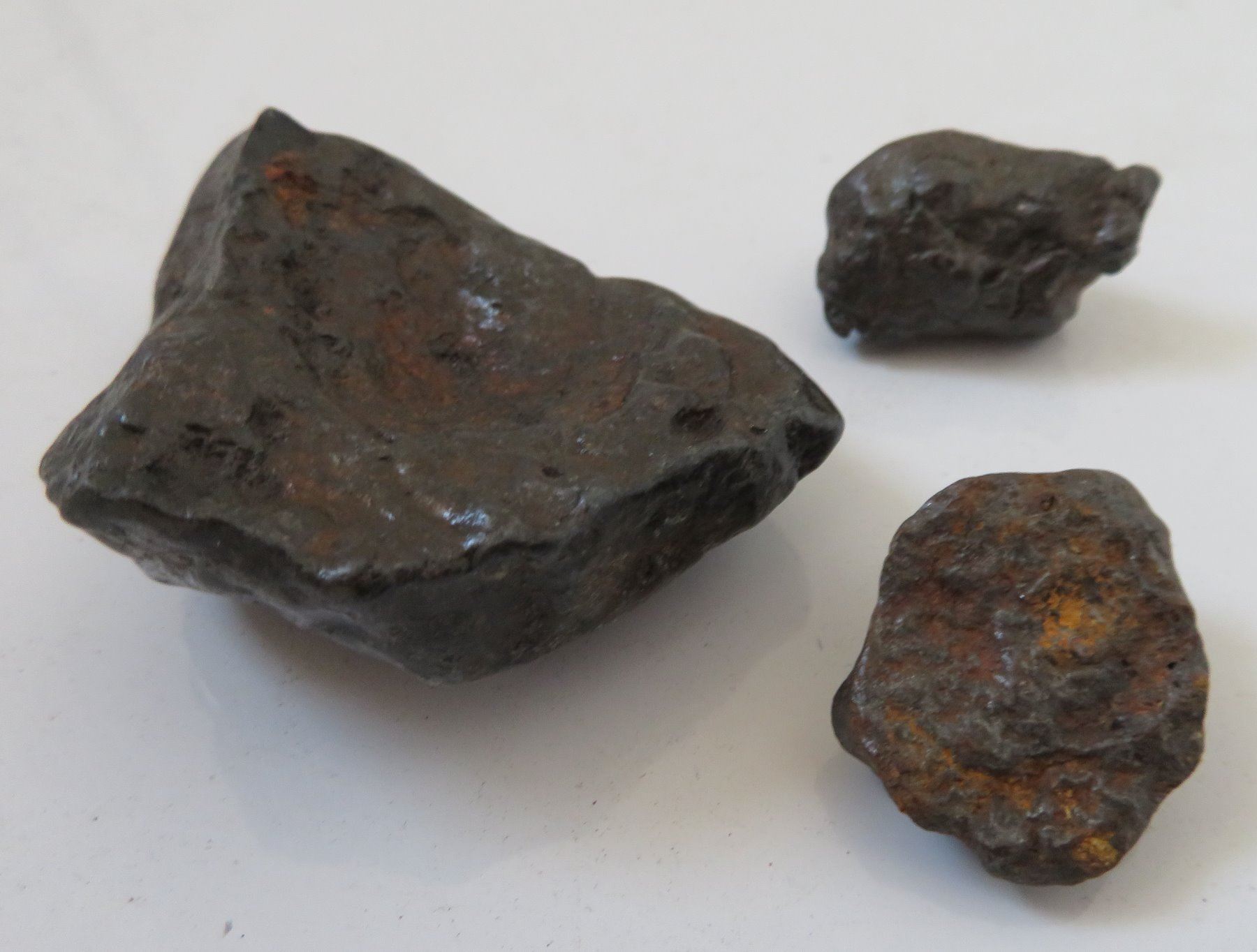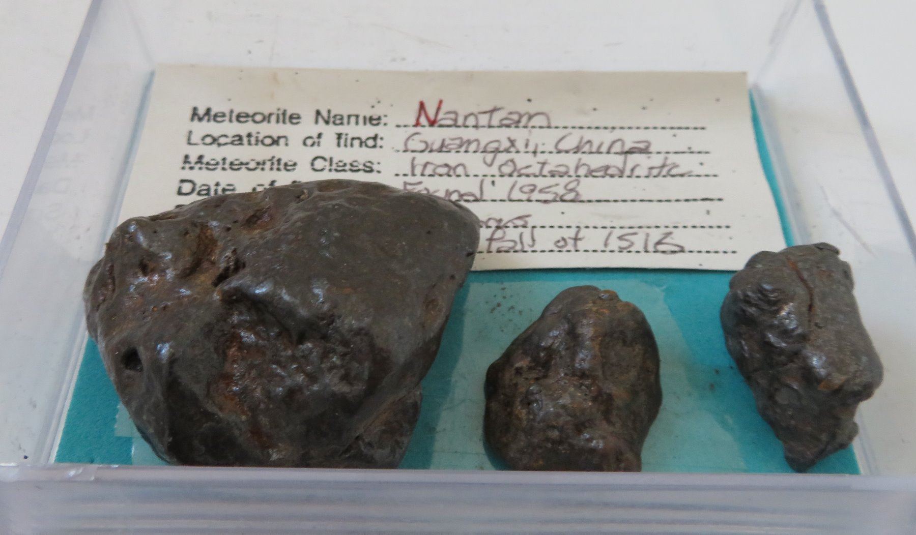 Meteorite Collection, found in 1958. Made of nickel and iron, the largest item measures 2" and total weight is approx. 57.8 grams. Nantan, China. Condition: Good, see images. Shipping: $16.50 w/insurance and signature, due to value.