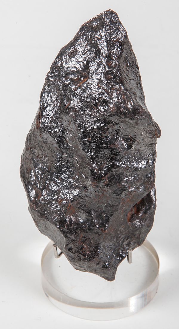 Meteorite From Meteor Crater. This esthetic 4 x 2 x 1 inch over 1 pounds (475grams) Canyon Diablo iron-nickel meteorite is a palm sized specimen of one of the most sought after iron meteorites by collectors. Most currently available Canyon Diablo meteorites are just a few grams in weight. Any sizeable specimens are hard to come by as the area around Meteor Crater near Winslow, Arizona has been closed for years. The nearly one mile in diameter crater was created over 50,000 years ago when a 50 foot in diameter meteor exploded high over the Arizona desert. This excellent quality meteorite possesses all of the qualities desired in a Canyon Diablo meteorite, excellent shape looking somewhat like a small early human hand axe with a sharp point and sharp edges attesting to the explosive force that broke up the huge meteorite, gunmetal color and several shallow distinctive regmaglypts (thumbprints) of varying sizes. Since no specimens are available from the source at Meteor Crater, the only way to acquire a specimen is when specimens are made available from collections. Comes on a 4 inch illusion stand for display.