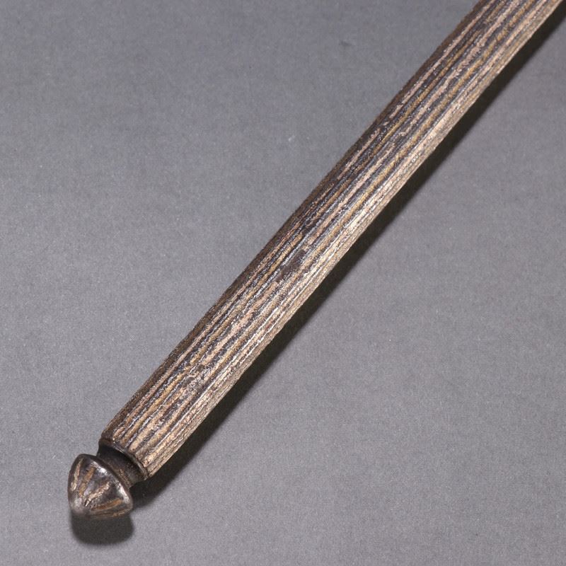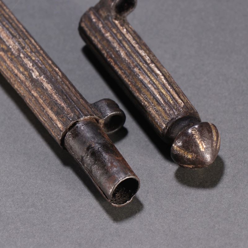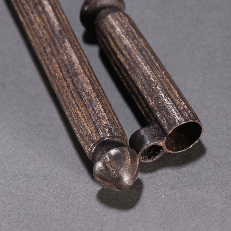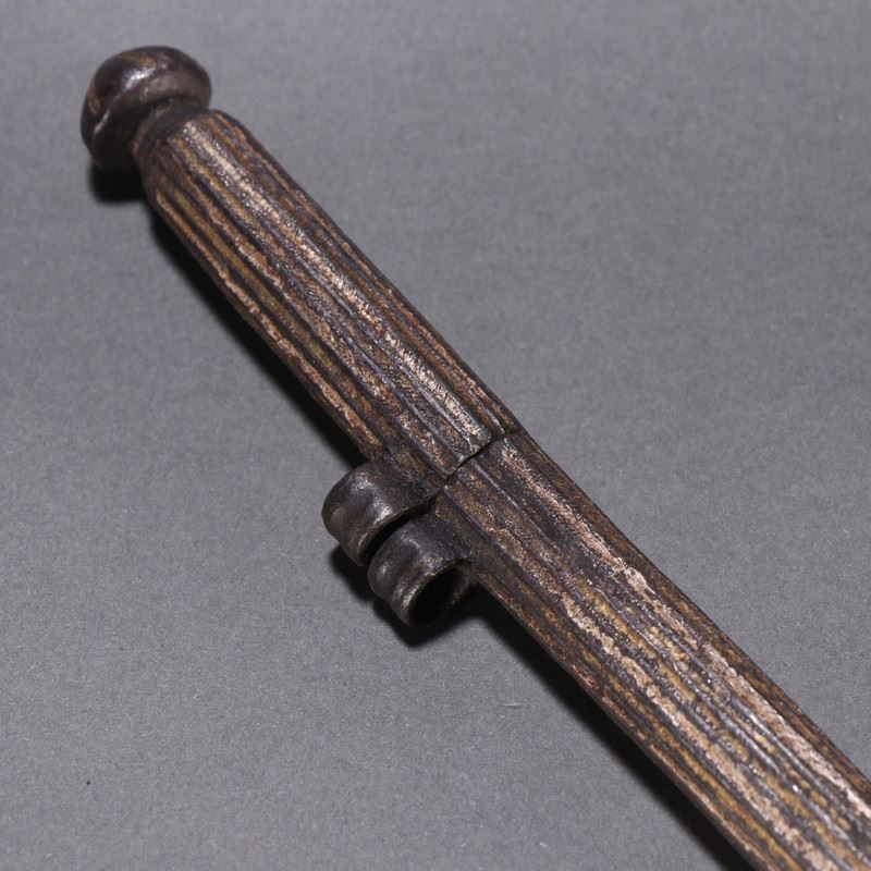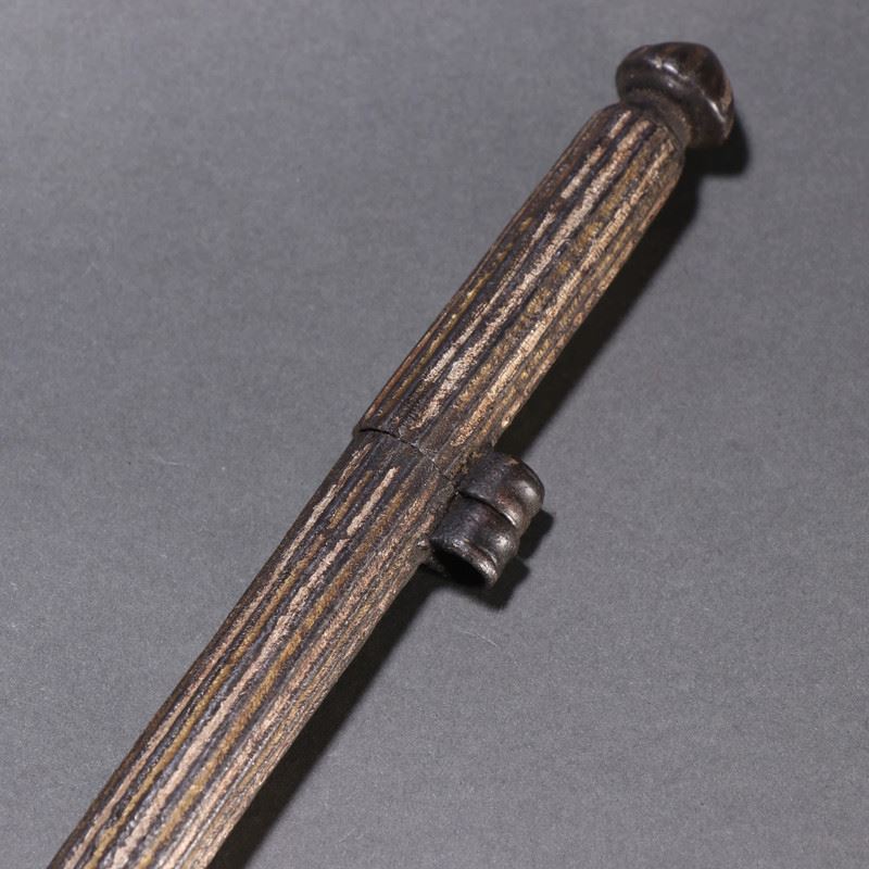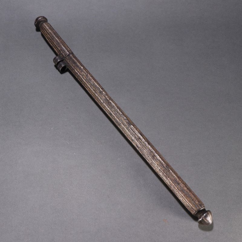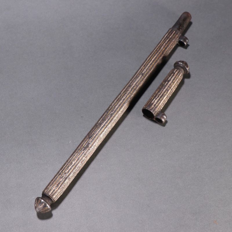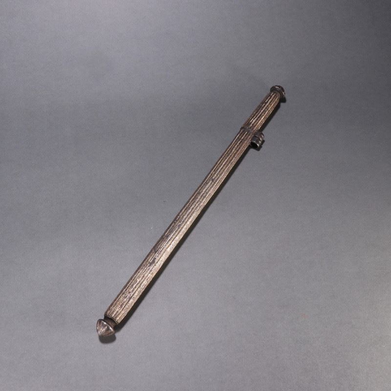 A portable cylindrical message tube with longitudinal flutes, end caps, and a central suspension loop for wearing or attaching to gear. The material is said to be meteoritic iron, showing natural oxidation and age patina—an austere, compelling object suited for display and collection.