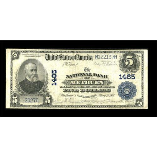 <B>Methuen, MA</B></I> - $5 1902 Plain Back Fr. 598 <B>The NB of Methuen</B></I> Ch. # 1485<BR> Large notes only from this tougher bank, which has fewer than a dozen pieces listed in the census. <B>Fine-Very Fine.</B></I><BR><I>From The Kansas City Collection.</B></I><BR><BR><b>Shipping:</b> Coins & Currency (<a target="_blank" href="http://www.heritageauctions.com/common/shipping.php">view shipping information</a>)