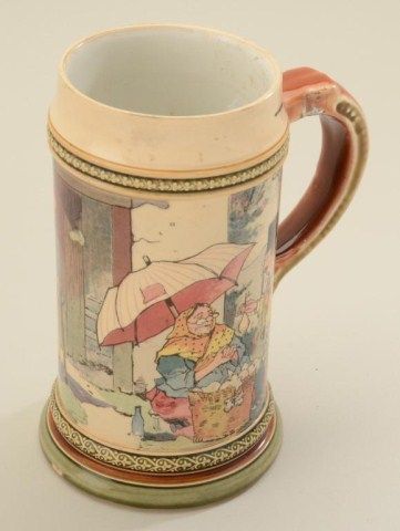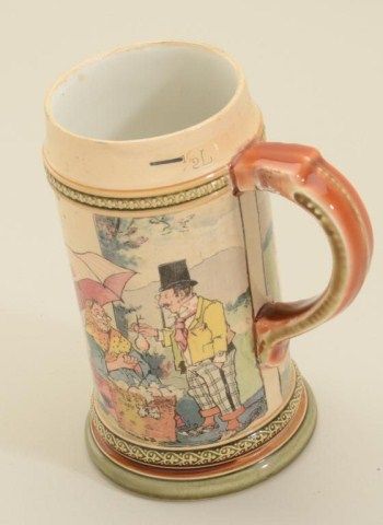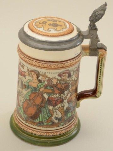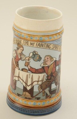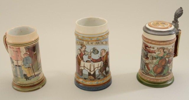 Metlach stein, #2094, 7” beer hall scene with musicians, Metlach #2640-L-Musketeer with lady and slogan in English “The last drop in the well as I gasped upon the brink, ere my fainting spirit fell tis to thee I woulddrink ½ liter” 7-1/2” liter stein #2140, small chips, some minor restorations but hard to find; looks great, glazed with humorous scenes, well marked. Est.: $100-$300.