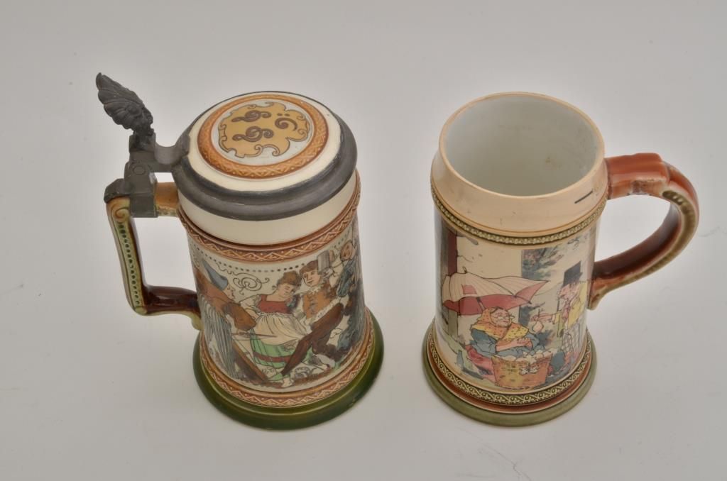 Metlach stein, #2094, 7” beer hall scene with musicians, Metlach #2640-L-Musketeer with lady and slogan in English “The last drop in the well as I gasped upon the brink, ere my fainting spirit fell tis to thee I would drink ½ liter” 7-1/2” liter stein #2140, small chips, some minor restorations but hard to find; looks great, glazed with humorous scenes, well marked. Est.: $100-$300.