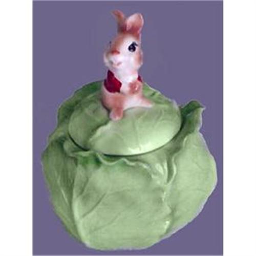 Produced by The Metlox Pottery Co. of Manhatten Beach, CA - circa 1970 this lovely cookie jar features a bunny rabbit atop a yummy cabbage. Measures about 11 inches tall and is in excellent condition.