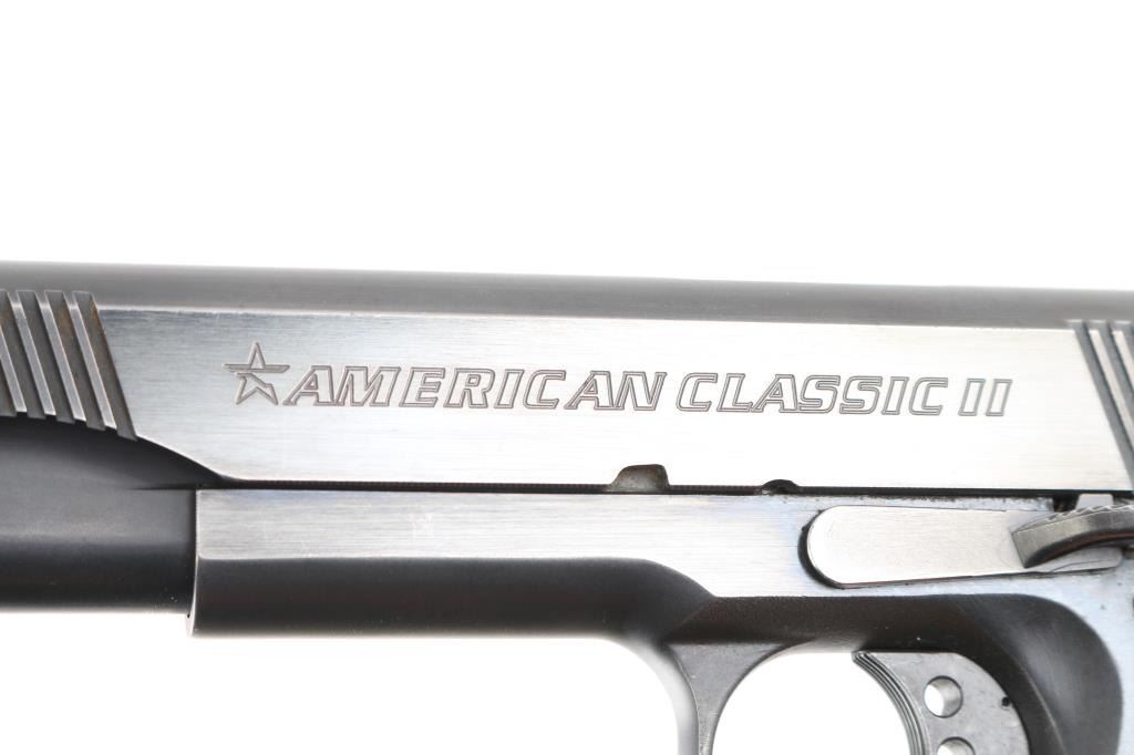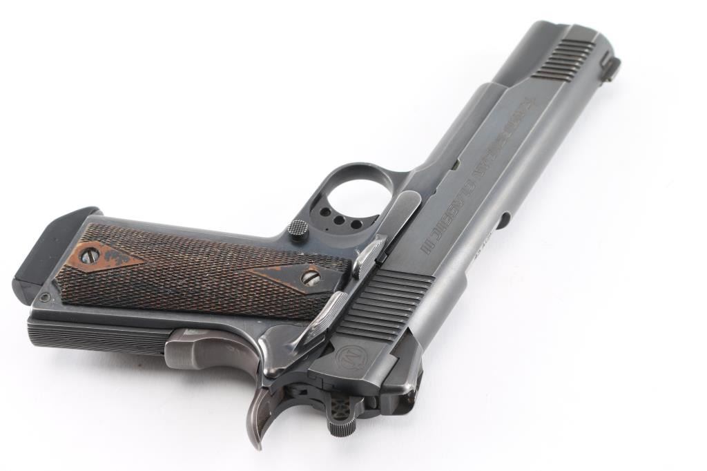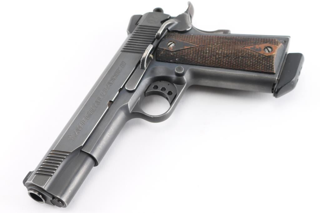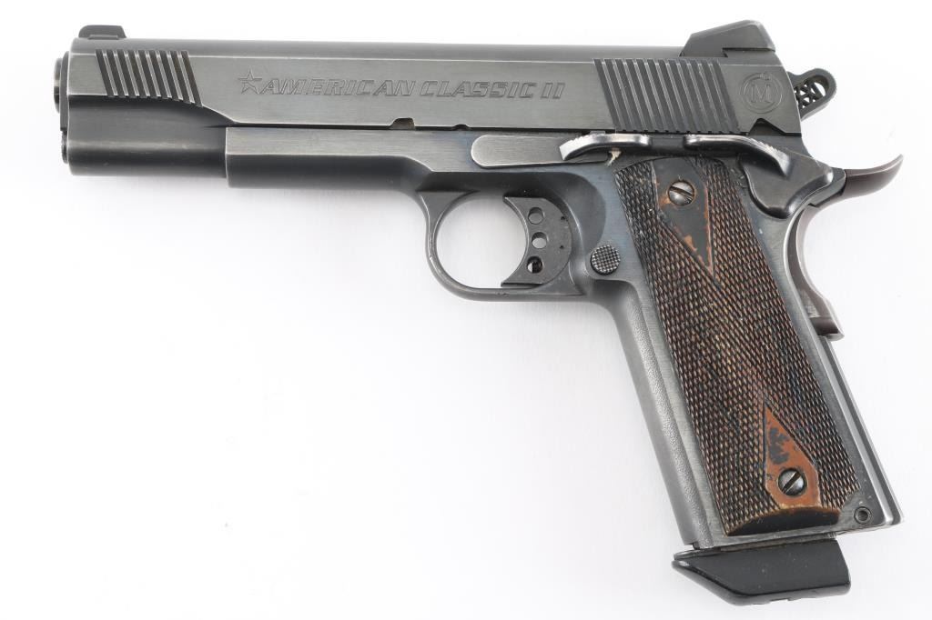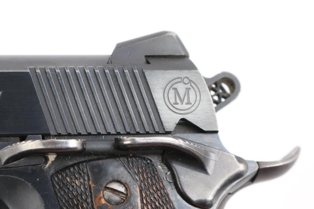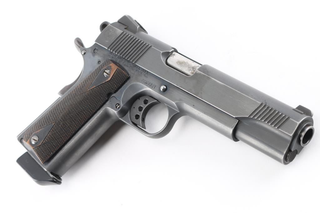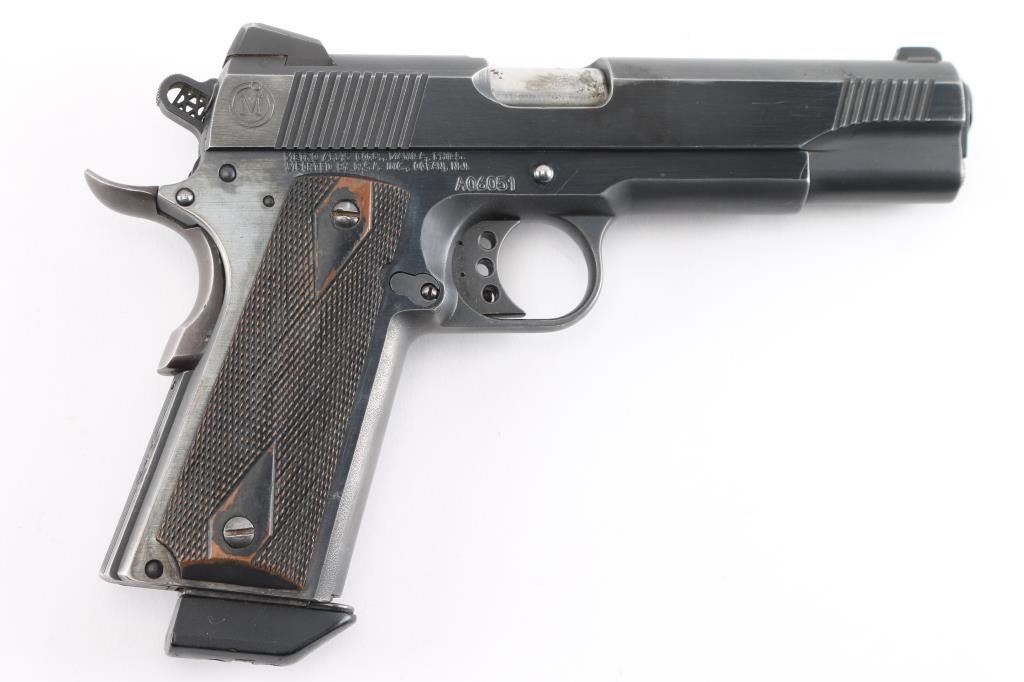SN: A06051. Produced by Metro Arms Corporation, a manufacturer based in the Philippines. imported by R.S.A. Ocean, NJ. M1911 style pistol, 8+1 capacity, blue finish, stainless barrel, dovetailed 3-dot sights, adjustable trigger, skeletonized hammer with "MA" cut into it. Checkered 'diamond' wood grips, beaver tail grip and thumb safeties, serrated, flat mainspring housing. Fore and aft serrations on slide. Bore is excellent/bright, action is smooth, grips are very good, blue is about 90% with handling/edge wear, some minor scratches. Comes with one 8 rd magazine with extended floor plate.