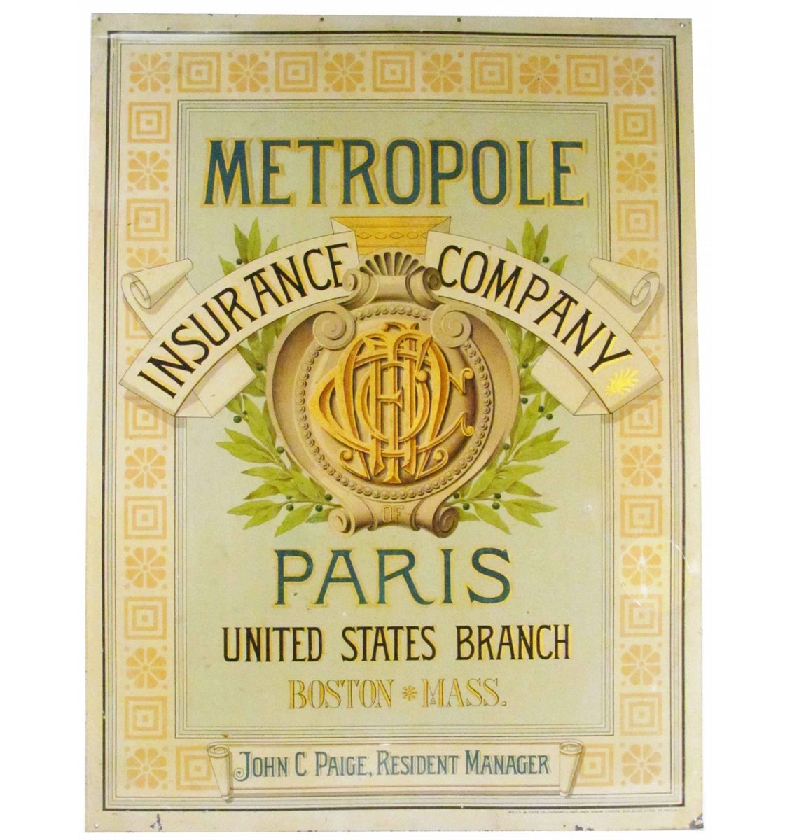 Metropole Insurance Company Tin Sign, Ca. 1870. United States Branch. Wells & Hope Co. Chromo-Litho. Excellent all original condition. 18 X 24 inches.