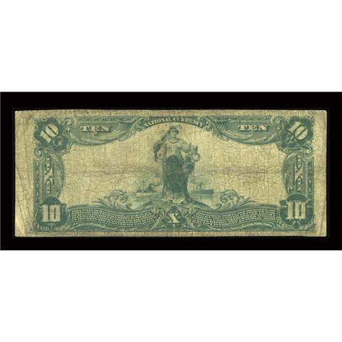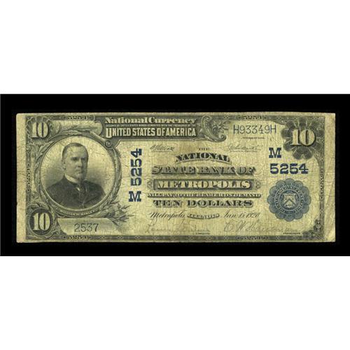 <B>Metropolis, IL</B></I> - $10 1902 Plain Back Fr. 633 <B>The National State Bank</B></I> Ch. # (M)5254<BR>Five large size comprise the census from this Massac County issuer chartered at the turn of the 20th century. <B>Very Good</B></I> with stamped signatures still visible.<BR><I>From The Lincoln Collection</B></I><BR><BR><b>Shipping:</b> Coins & Currency (<a target="_blank" href="http://www.heritageauctions.com/common/shipping.php">view shipping information</a>)