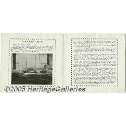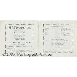 <B>Metropolis (UFA, 1927)</B></I> French Program (Multiple Pages). Fritz Lang, impressed during a visit to New York City by the cities skyline, went on to create what many consider to be the greatest science-fiction film ever made. When the film was released in 1927, all sorts of posters, media and programs promoted the picture. Ostensibly, we'll call this lot a French program since it's pre-dominantly in French and the advertising printed inside is French; however, it has more of an international feel since the film's synopsis is translated in German and English. The program has 24 interior pages and features several stills from the film. The program is in excellent condition showing a very slight impression of it being lightly folded in half at one time. Very Fine.