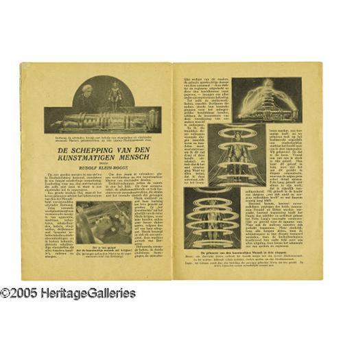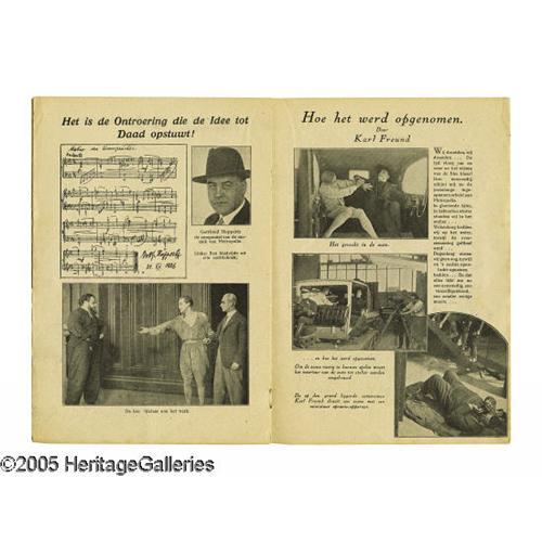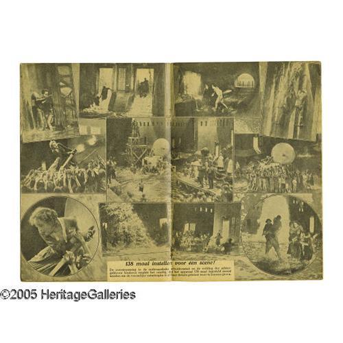 <B>Metropolis (UFA, 1927).</B></I> Program (Multiple Pages). Fritz Lang's masterpiece presents a dystopian world that would influence films into the 21st century. Surprising, then, that the film has suffered from a myriad of worst-case scenarios: the worst endorsement for a film (by Adolf Hitler), the worst financial performance (it cost so much that it nearly sent the studio, Universum Film, into bankruptcy) and the worst preservation (nearly a quarter of it has been lost since its release). Fortunately, the film endures as one of the best of all time, and this Dutch language program reminds us why. The program recounts in both text and art the ambitiously allegorical story of two worlds, the thinkers and the laborers. Slight spine wear, some back cover soiling, and staining on the upper-left corner of the pages do not detract from this fascinating book -- offered here complete and intact, a rarity for this title. The pages are a clean off-white color and offer wonderful contrast. Fine-.