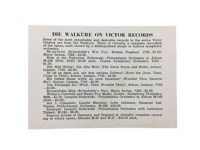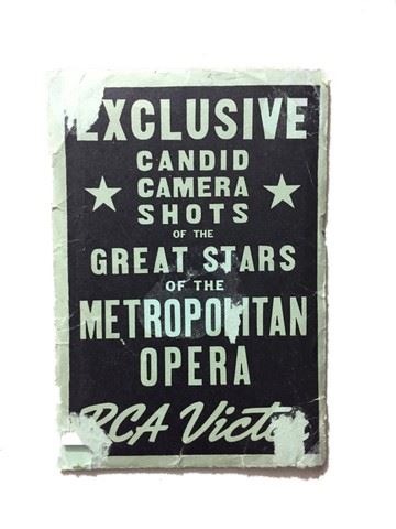 Two sets of rare and vintage promotional items (~24) from the Metropolitan Opera ca. 19th Century (approx. 4 x 3 in). These are exclusive candid camera shots of the Great Stars of the Metropolitan Opera, RCA Victor stars of the opera Die Walküre and La Traviata. These rare black and white photographs are printed on paper and verso is a caption about the image. There are images of famous stars as well as images of those connected with the productions such as: "Die Walkure" with Lucrezia Bori, Milton Cross, Kirsten Flagstad, Ludwig Hofmann, Lauritz Melchior, Friedrich Schorr, Jose Ituri (conductor). The stars and those connected with the production of "La Traviata" are Vina Bovy, Lucielle Browning, Nino Martini, Ettore Panizza (conductor), John Charles, Thomas, Thelma Votipka. All camera shots are in very good condition and come in the original blue and green envelopes. There is water damage, holes and tears to the envelopes. Flaps are missing. Printed on the envelope of La Traviata is “Form 2697 and Printed in the U.S.A. “ Printed on the information card and the envelope of Die Walküre is “Form 2698 and Printed in the U.S.A.“