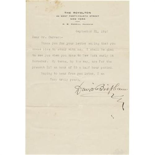 <B>Metropolitan Opera Baritone David Bispham Typed Letter Signed</B></I> “<I>David Bispham</B></I>”. One page, 5.75” x 8.5”, on The Royalton hotel letterhead, New York, September 21, 1916, to a “Mr. Carter”. The letter reads in full: “Thank you for your letter saying that you would like to study with me. I shall be glad to see you when you come to New York early in November. My terms, by the way, are for the present $10 an hour of $5 a half hour period.” <BR><BR><b>Shipping:</b> Flat Material, Small (<a target="_blank" href="http://www.heritageauctions.com/common/shipping.php">view shipping information</a>)