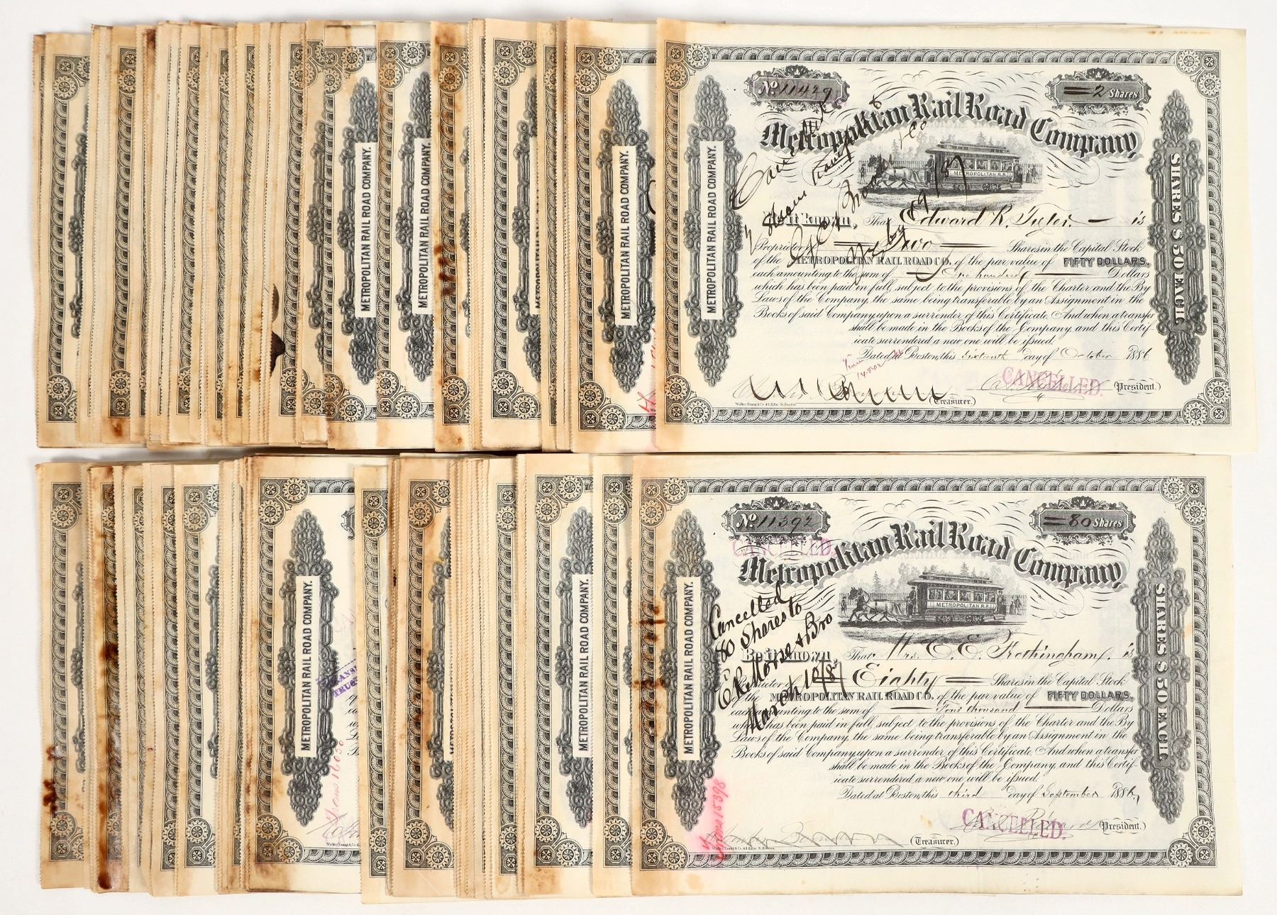 These stock certificates are for the Metropolitan Railroad Co. issued 1886. Over 120 stocks. Please see photo for details.