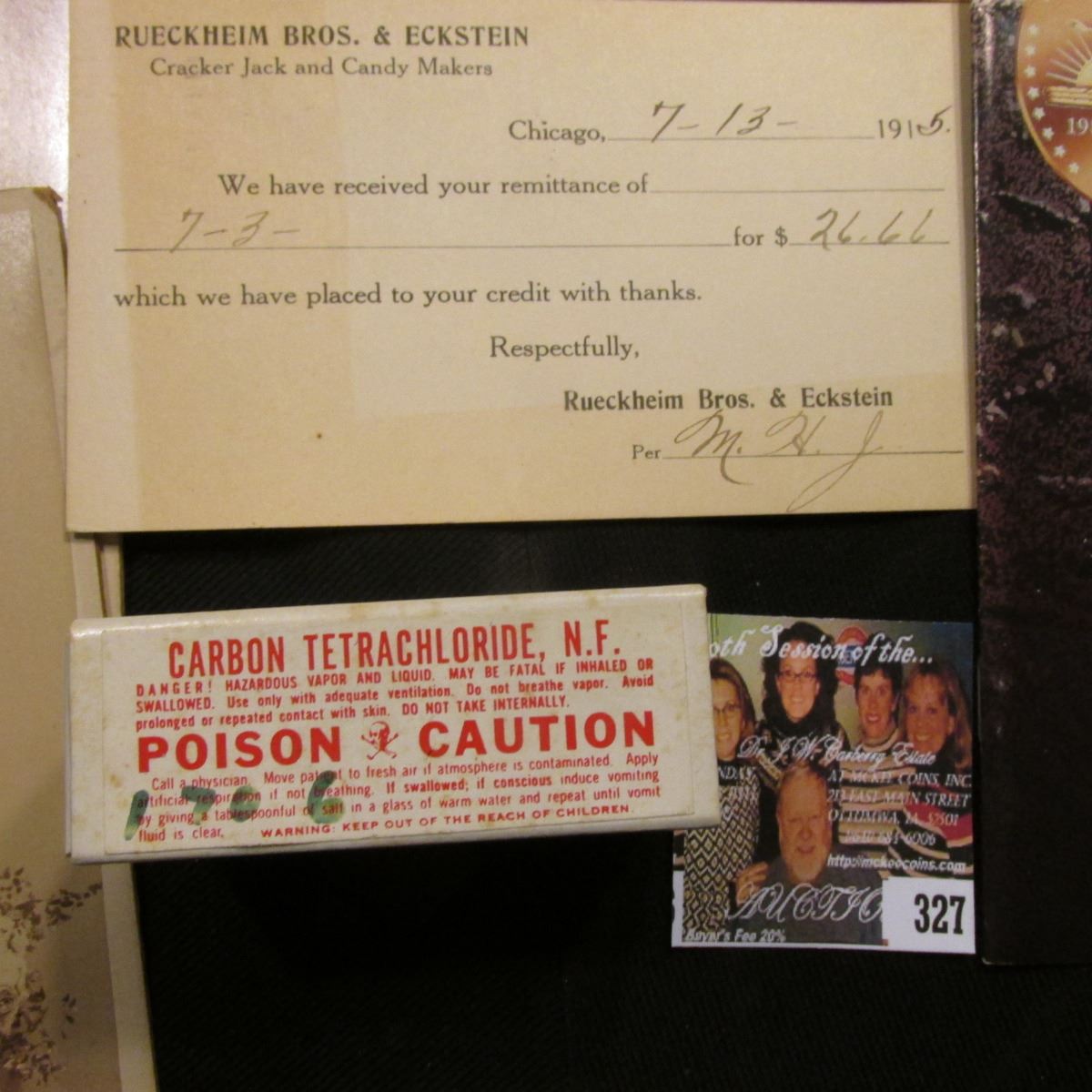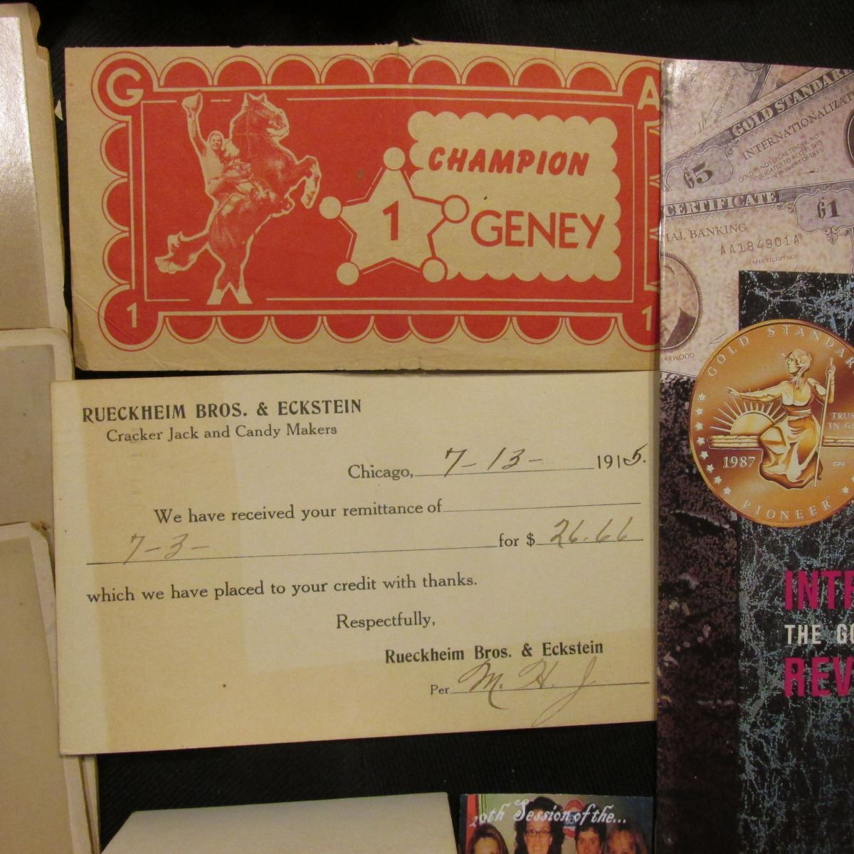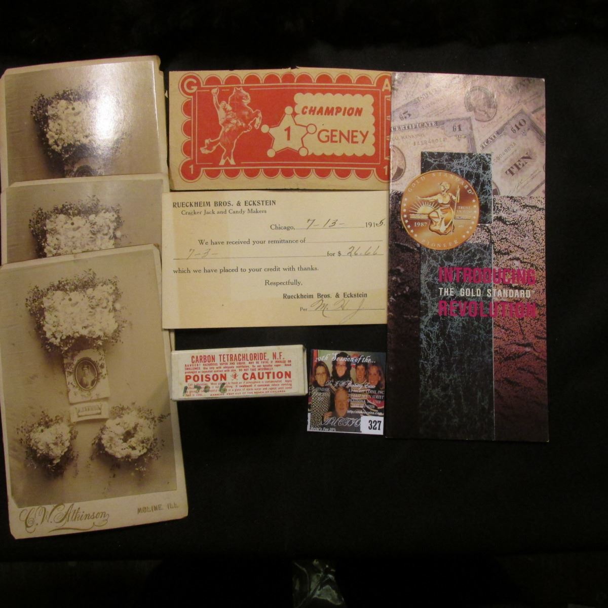 "Metropolitan The Gold Standard Revolution" brochure; box of Poison labels for Carbon Tetrachloride; 7-13-1915 Postcard "Rueckheim Bros. & Eckstein Cracker Jack and Candy Makers"; scrip "Champion Geney", "Gene Autry 1 Geney"; & (3) "C.W. Atkinson…Mother" black & white photos of flower arrangements possibly for a funeral.