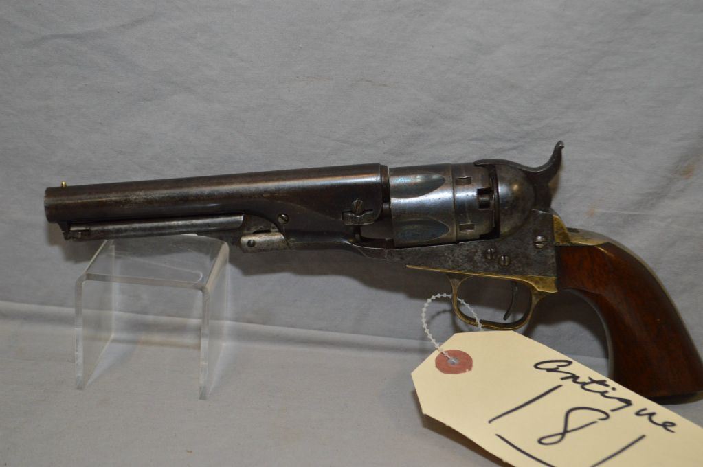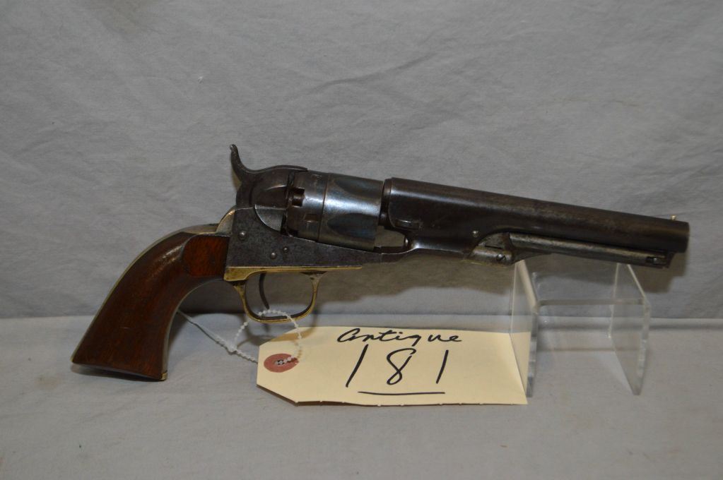 Metropolitian Arms Co. Model Police Model .36 Perc Cal 5 Shot Revolver w/ 5" rnd bbl [ blued finish starting to fade, case hardened frame, lever and hammer, one piece walnut grips, all matching serial numbers including cylinder, barrel markings " Metropolitian Arms Co. New. York", brass trigger guard & straps with some silver plate tarnished and black spots on butt, Circa 1864 - 1866, Production Quatity Approx 1600 in that serial number marked specimens ] Ser # 3015 ANTIQUE NO PAL REQ