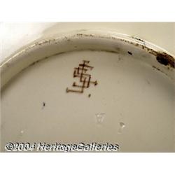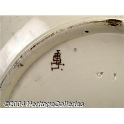 Mettlach: <B>A PAIR OF CIRCULAR FRAMED FRENCH PORCELAIN PLAQUES (France) </B></I><BR>c.1880<BR><BR>The soft paste porcelain plaques depict a Victorian man and lady framed in metal with classical designs, artist marks on both, black underglaze<BR>17in. diameter 2 Items <BR><BR><B>Important notice:</B> Heritage usually auctions material at the rate of 200-250 lots per hour. On some occasions eBay Live bid software or the Internet may not be able to keep up with the pace of the auction. We recommend placing a realistic absentee bid now as insurance to avoid disappointment. Occasionally the auctioneer may eliminate or reject an eBay Live bid, and the auctioneer may also reopen a lot after the close of the eBay live bidding (usually because we missed an audience bid), and may reject your bid even if it shows you as the winning bidder. By bidding via eBay Live, you agree that Heritage may award the lot to another bidder at its sole discretion under the circumstances described above or any other reasonable circumstances. Since eBay bids are not shown to us until we open the lot on the floor, we treat those bids just like floor bids. In most cases the floor responds before the eBay bid is presented to us, due to Internet lag time, so for consistency we have made it a policy that floor bids are always considered first over tie eBay live bids. Also please note that all Heritage lots purchased through eBay Live carry a 24.5% Buyer's Premium. Please make sure you read the Terms and Conditions before you bid.