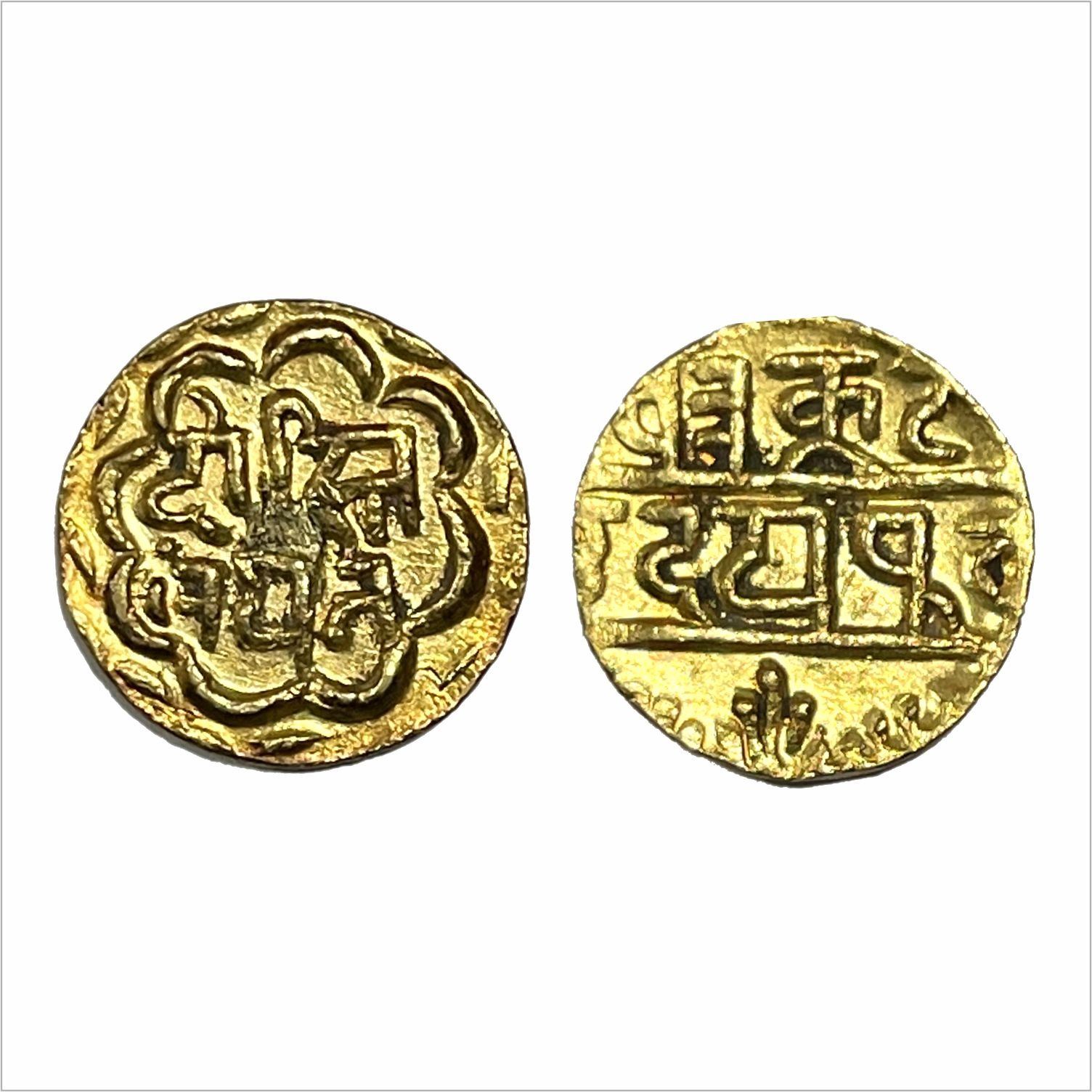 Mewar-Udaipur, swarupshahi series, Gold ½ mohur, 5.47g, struck at Udaipur Mint. Obv: Nagari legend Dosti/Landhan (Friendship with London). Rev: Nagari legend Chitrakut/Udaipur, KM YC12.