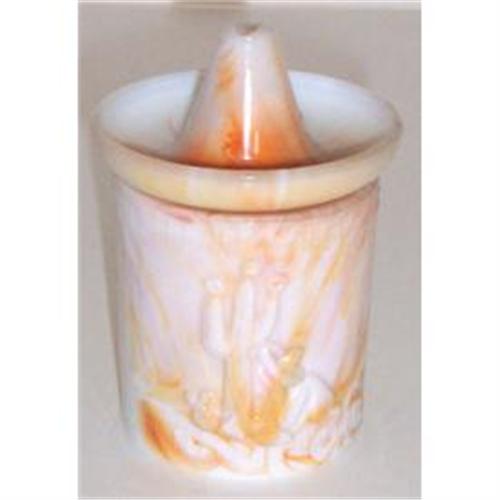The Mexicali powder jar was made for the Pickwick Cosmetic Corp. One side of the base has an embossed figure of a seated Mexican having a siesta under a cactus, on the opposite side he is playing a guitar. The lid is shaped like a sombrero. This orange marbleized powder jar is shown on page 64 of Whitmeyer - Bedroom & Bathroom Glassware of the Depression Years. Both the jar and its lid are in excellent condition.