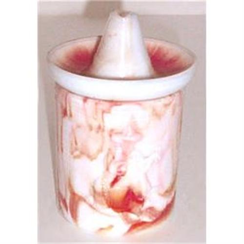 The Mexicali powder jar was made for the Pickwick Cosmetic Corp. One side of the base has an embossed figure of a seated Mexican having a siesta under a cactus, on the opposite side he is playing a guitar. The lid is shaped like a sombrero. This red and orange marbleized powder jar is shown on page 64 of Whitmeyer - Bedroom & Bathroom Glassware of the Depression Years. Both the jar and its lid are in excellent condition.