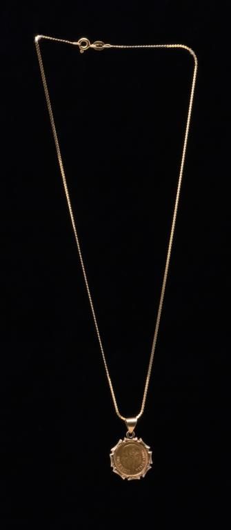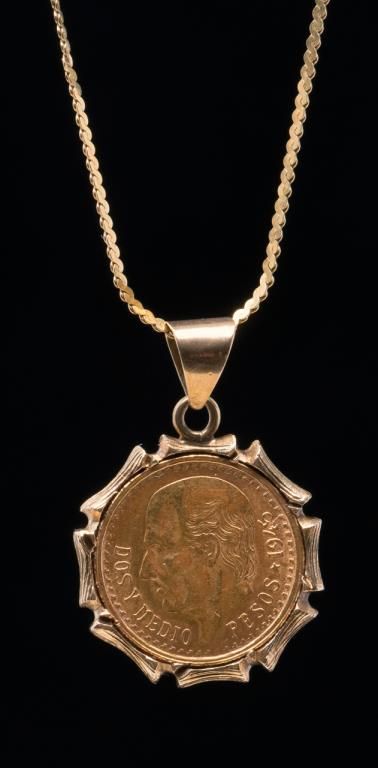 Mexican 2-1/2 Peso gold piece in old rose gold bezel with chain dated 1945 with mount and chain of that era; estate piece. Est.: $100-$200.