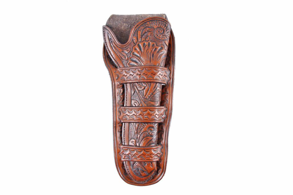 Mexican 3 Loop Pattern Holster Made for a 7 1/2" Colt SAA, entirely hand crafted by the late JR Laird of Santa Fe, NM. A handsome holster constructed of rich leather russet skirting and finely hand carved foliate and floral motif completely envelops thisMade for a 7 1/2" Colt SAA, entirely hand crafted by the late JR Laird of Santa Fe, NM. A handsome holster constructed of rich leather russet skirting and finely hand carved foliate and floral motif completely envelops this quality "one of akind" classic JR Laird holster, who wrote the dedicated book, "The Cheyenne Saddle", about the world renowned leather crafters, Frank A Meanea and the Collins Brothers of the late 1870s circa, Wyoming. The maker, "JR Laird, Santa Fe, NM",branded his name and origin on the toe of the holster. Also includes a copy of Jim Lairds book, The Cheyenne Saddle, fourth printing in 1999, and probably the last, since Jim died in 2005. Thisbook is extremely informative Historical book on the pioneer leather craftsman of the last century.