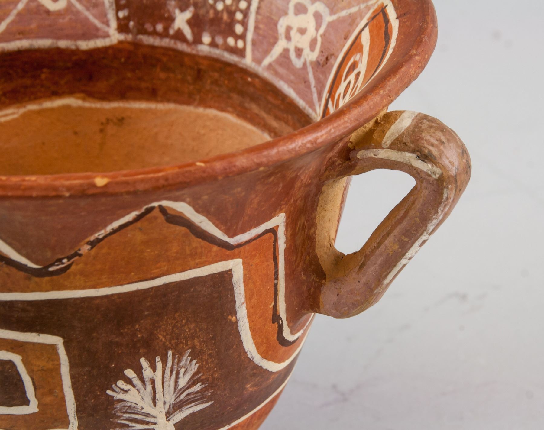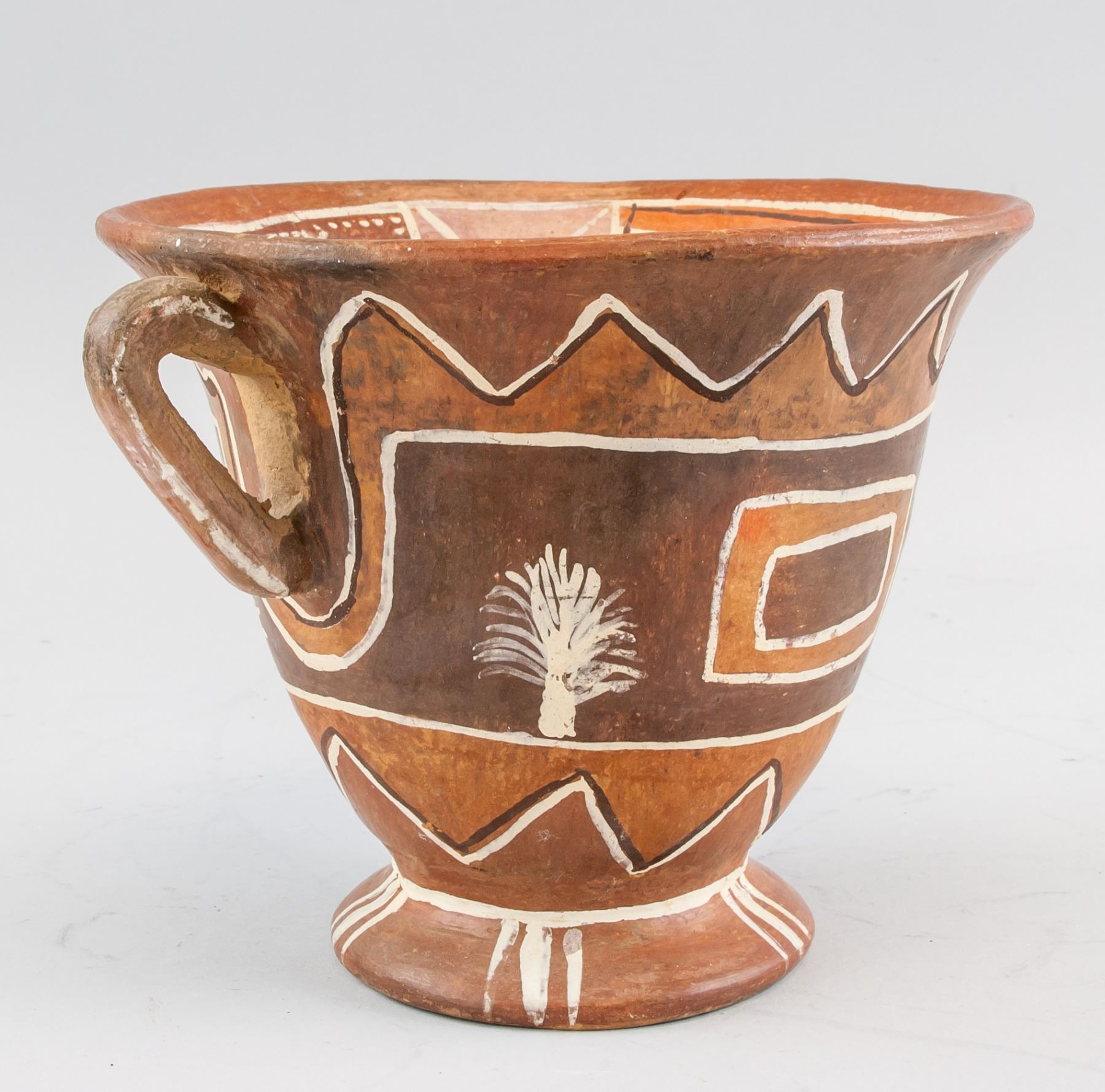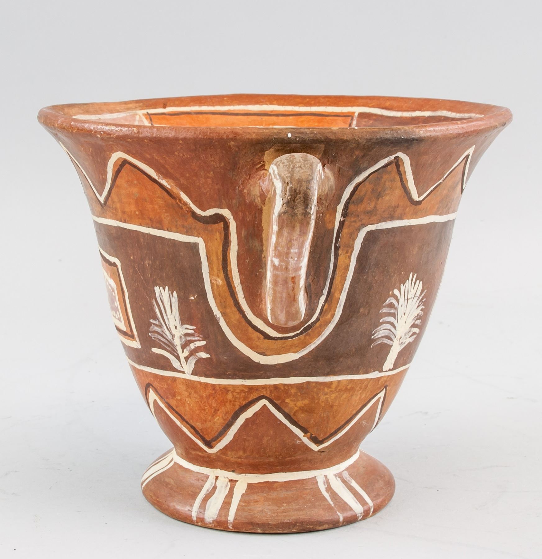 Mexican aboriginal pottery pot, of semi cone form body, flanked with curved handles, painted with straps and grass, H: 15 W:18 cm, 866 gram