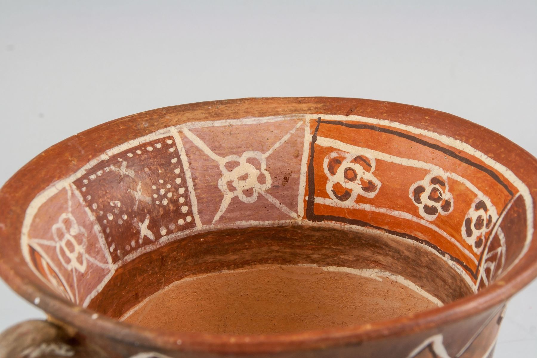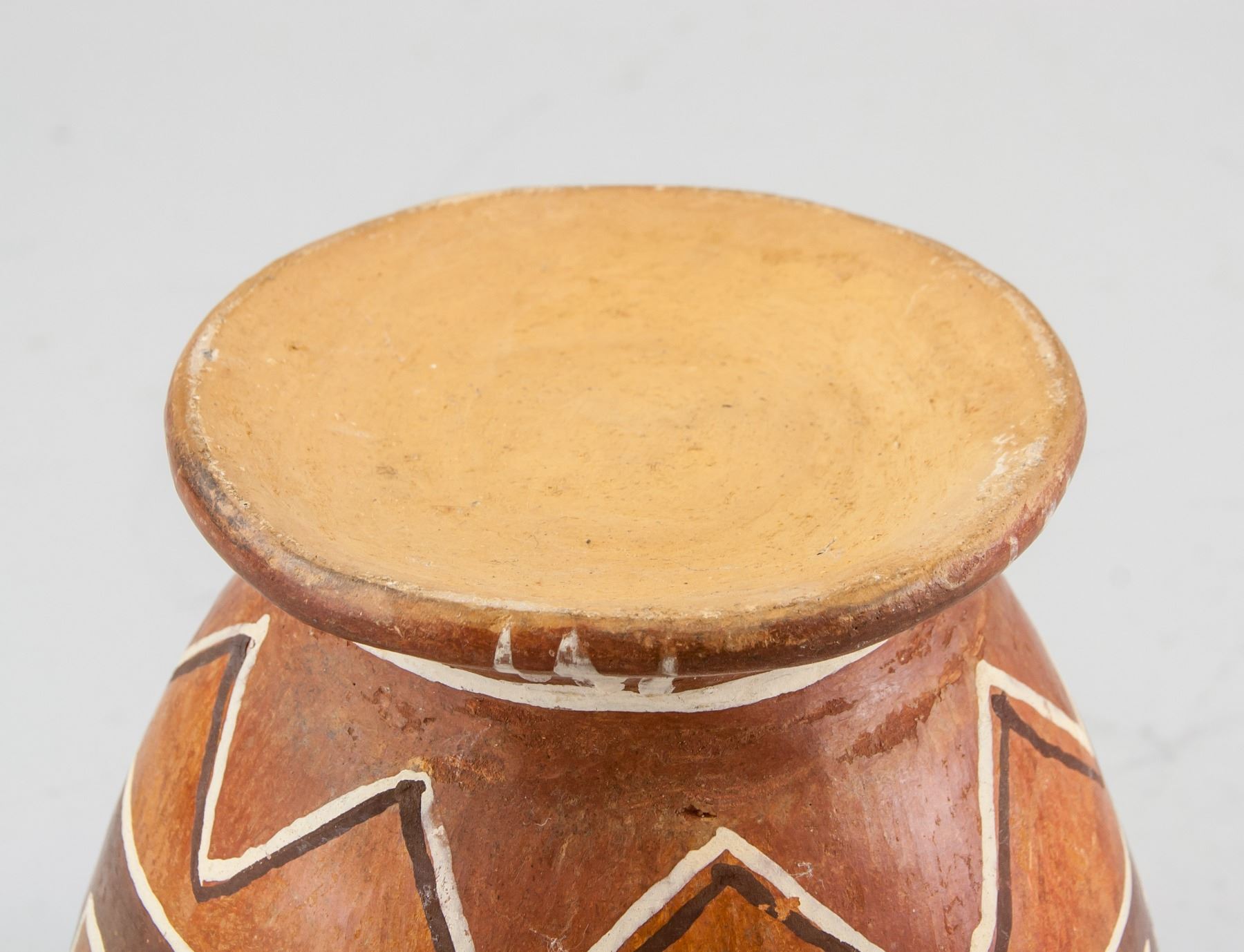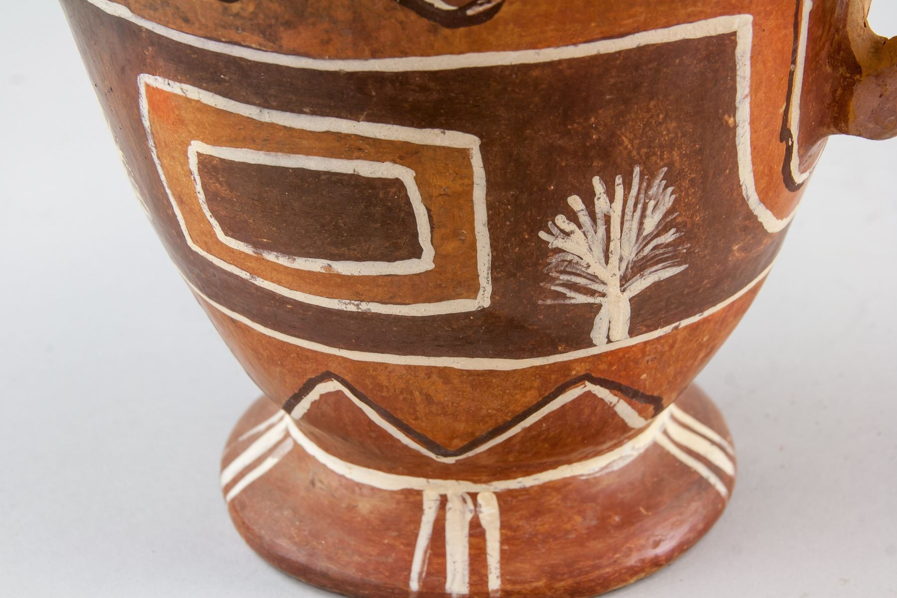 Mexican aboriginal pottery pot, of semi cone form body, flanked with curved handles, painted with straps and grass, H: 15 W:18 cm, 866 gram