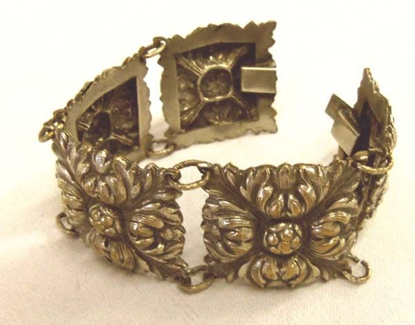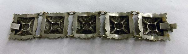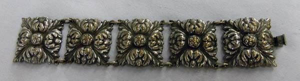 Mexican Alpaca Silver Link Bracelet. Five square links of alpaca silver, repousee' floral pattern. The bracelet measures 6 7/8'' x 1 1/4'' wide.