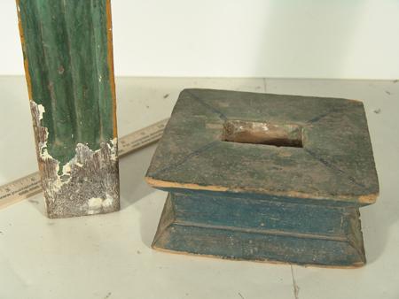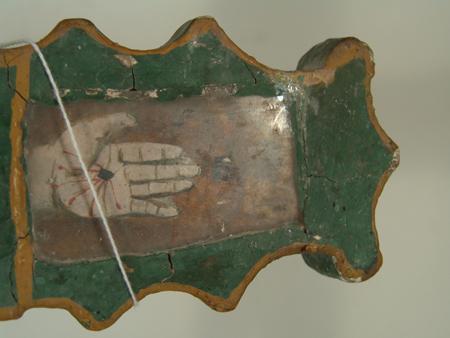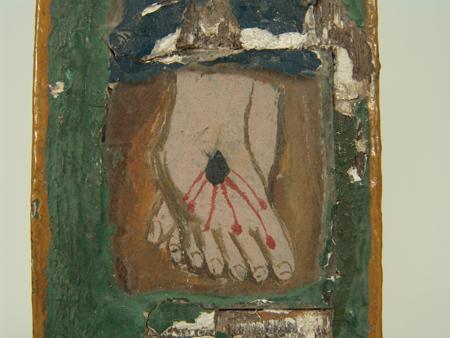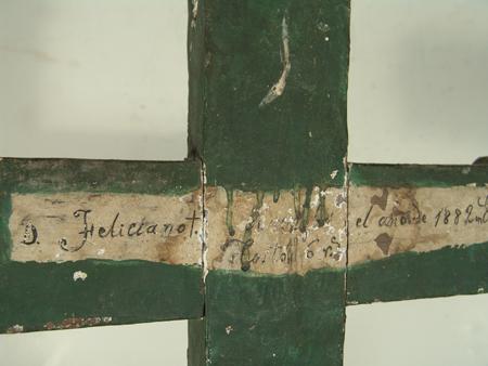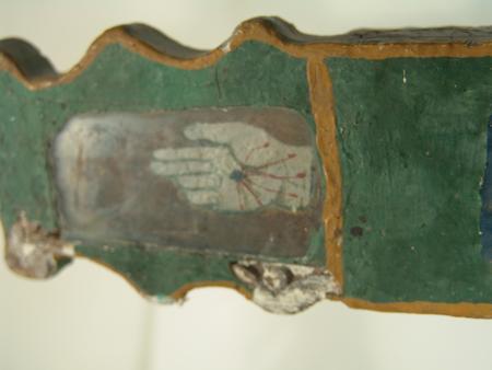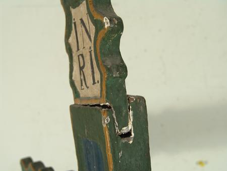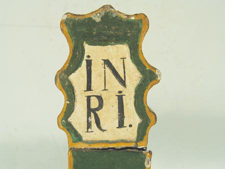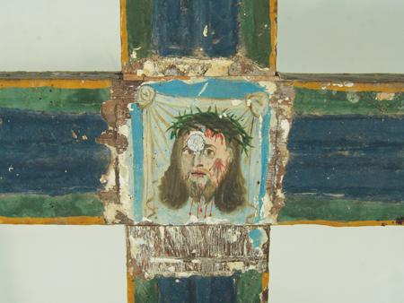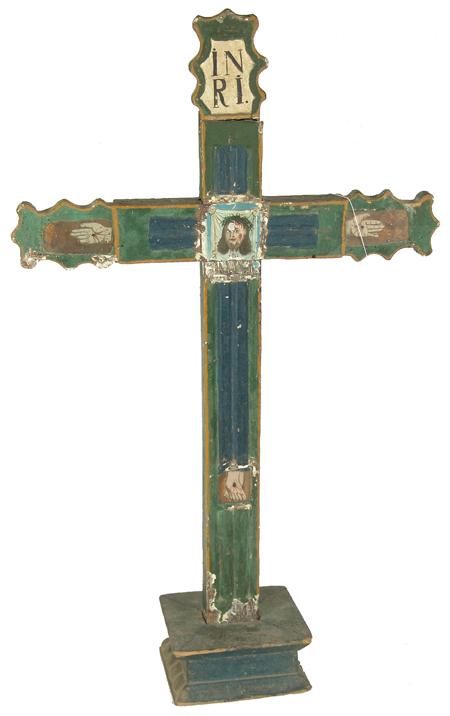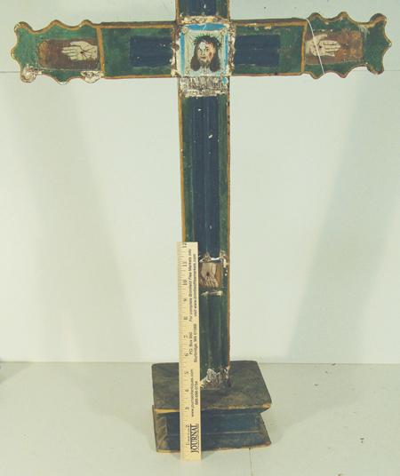 Tall hand carved and painted wooden cross in stand with Christ's face in center and his hands and feet visible behind inlay panes of glass. Condition: good. 31" x 18"